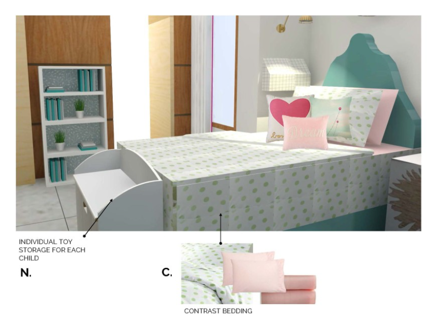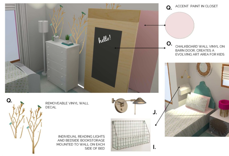 2. DEFINE SENSE OF PERSONAL AND SHARED SPACE. By designating each girl with a toy storage and reading area it helps define their personal sense of place within the room. Other areas like the bookcase at the entry door and the chalkboard decals on the closet door give them areas where items and activities can be shared.