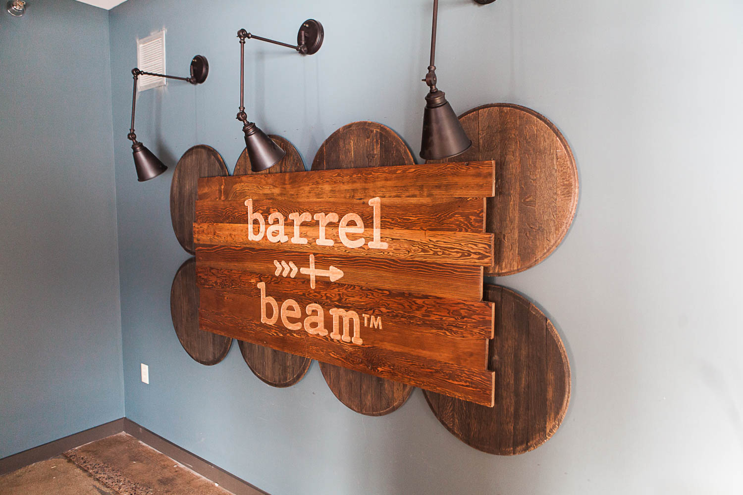 I talked a little bit about the entryway in the Design Plan post. This area was a moving target–constant changes to the building plan, ceiling height and column locations kept us on our feet. In the end it worked out perfectly and an area for this amazing branding wall was chiseled out from all the changes. The sign is made from reclaimed tongue and groove ceiling boards from the original building and was engraved locally by Bill Schumann.