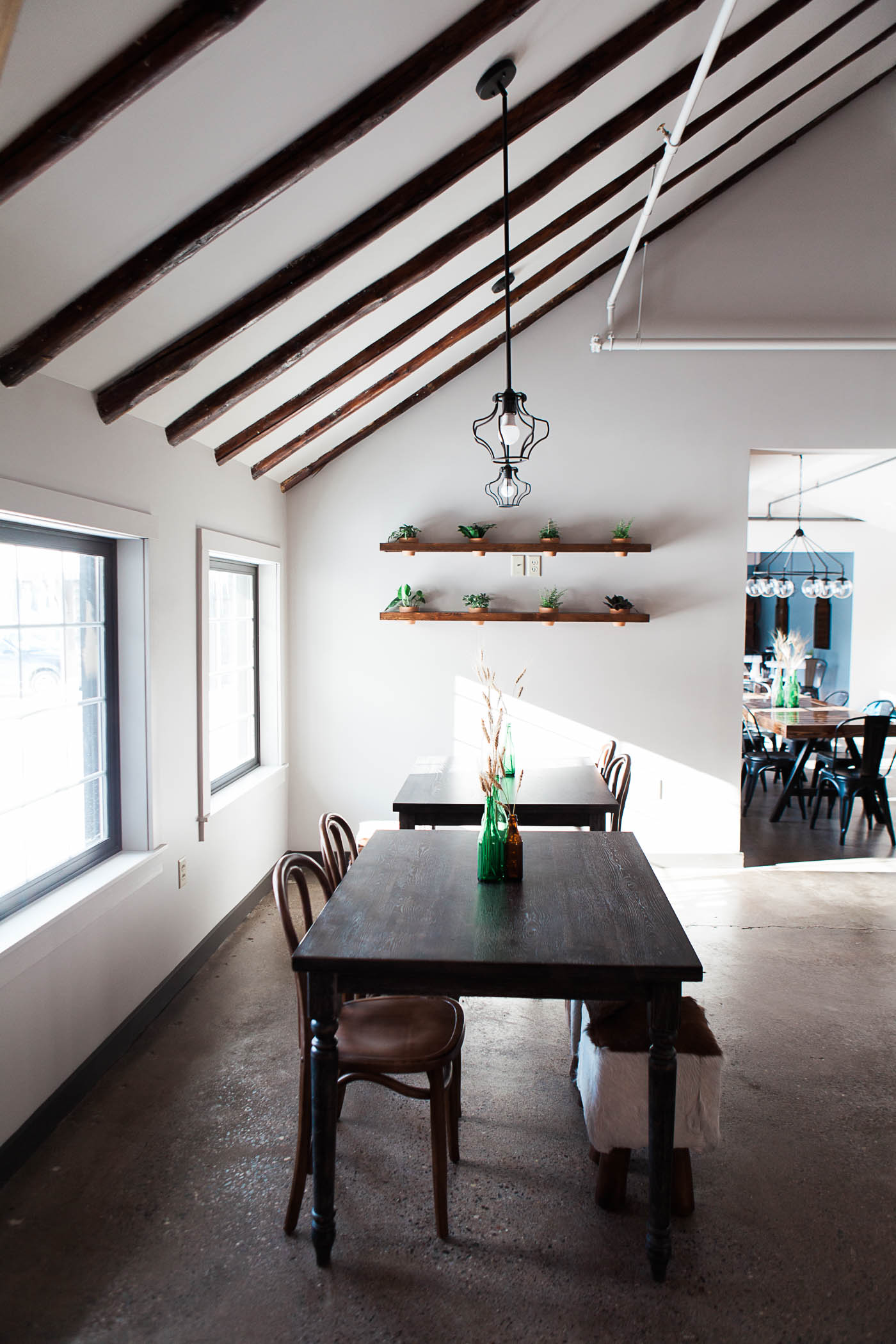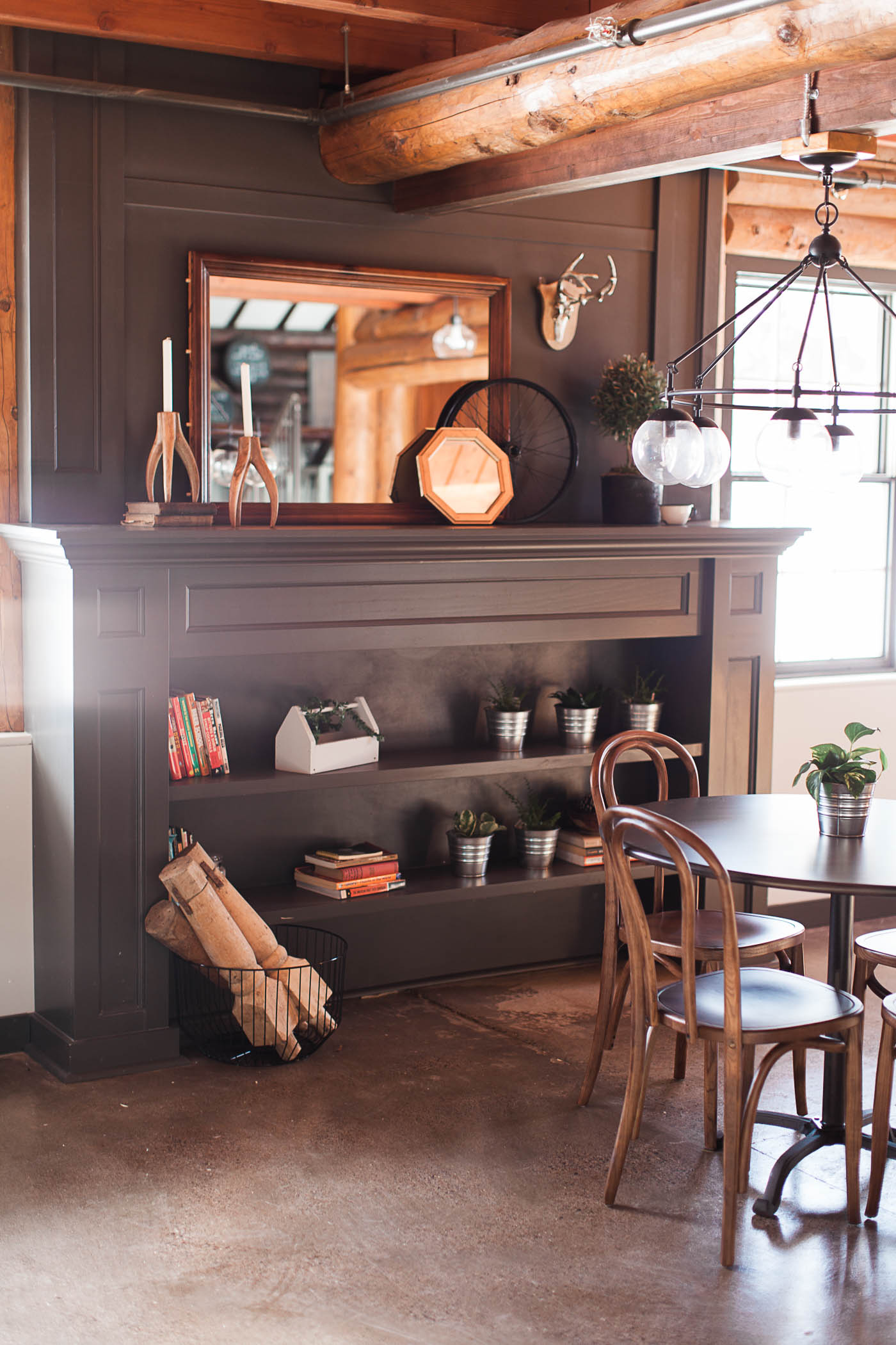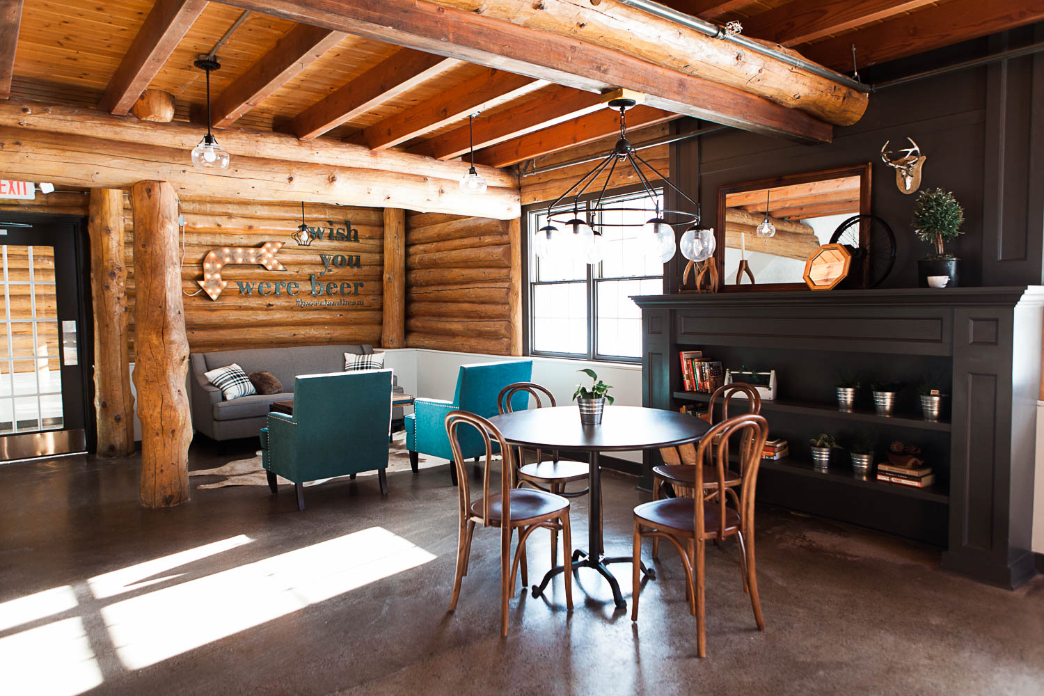 Converting and adapting an old building into something completely new often means some funky or chopped up floor plans. In order to make this feel intentional, and like the electic cabin vibe we were going for, we used a variety of seating areas. There are intimate and cozy spots for 2, large tables for groups, and clusters of tables to encourage community and conversation.