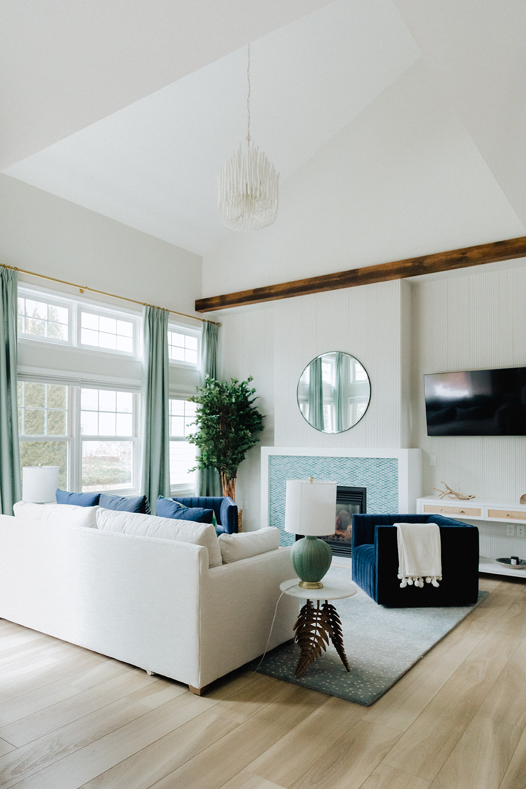The drama of a wood beam along the ceiling line allowed us to create a more grounded feeling when we applied a wood tambour texture to the mantle wall. Bonus! This allowed us to accentuate the height of the gorgeous vaulted ceiling.