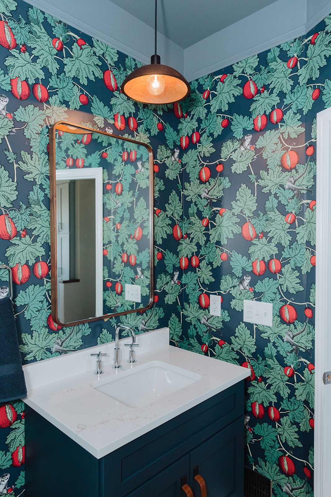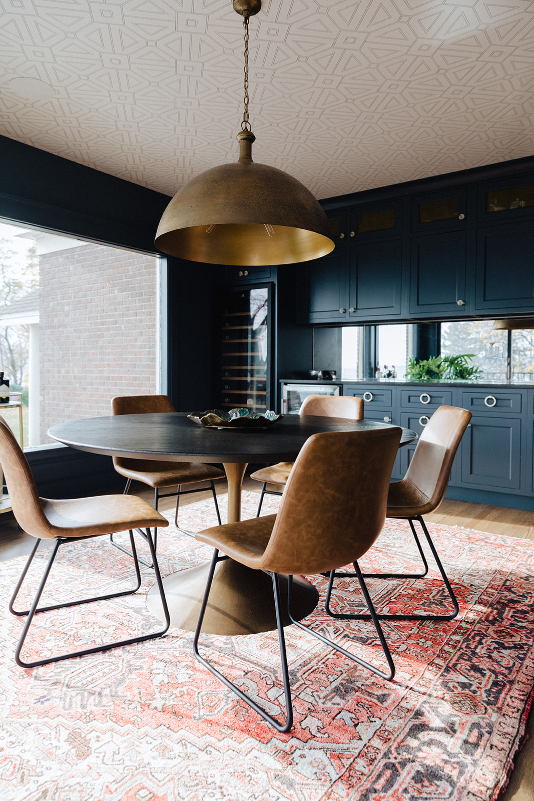 A subtle geometric pattered wallpaper was applied on the ceiling makes a large room much cozier. The dark, rich color of the cabinets partnered with the extra dimension overhead creates a more interesting, layered, feeling.
