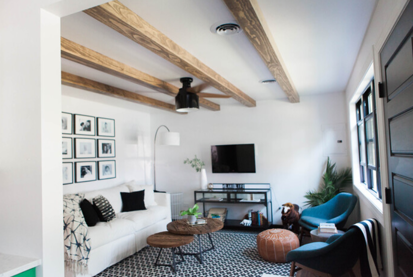 Adding architectural beams is not only for high spaces–just like going for a dark color on the walls of a small space –you can add beams and ceiling elements with average ceiling heights to emphasize coziness and add detail .