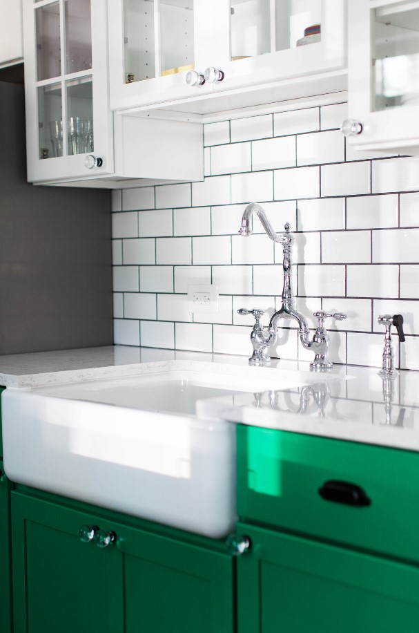 Farmhouse sinks are great as an added aesthetic  and generally come in cast iron or more decorative metal. Our tip though? With a farmhouse, be prepared to do a little bit of maintenance. Spills will inevitably come out of the sink and run down the face, ending up on the top of your cabinet doors. if this isn’t wiped away, it will degrade your cabinets over time. Ask your designer or cabinet installer if you can use a color matched PVC edge tape on the top of these cabinets to protect them from water running down.