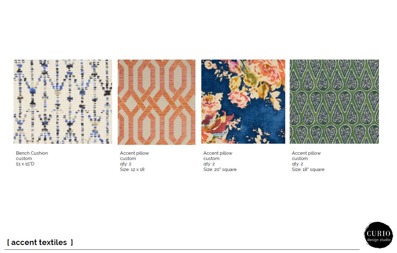 We injected some more pattern to compliment the wallpaper through various accent textiles for the chair and sofa pillows. Because–hey– when you have client ready for color + pattern you go for it!