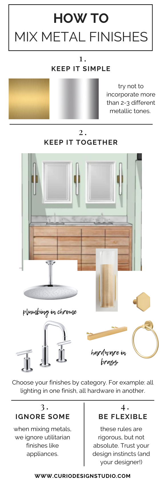 - Keep it together: utilize groupings of 3-5 metallic objects to create a sophisticated and balanced look. Choose your finishes by category. For example: all lighting in one finish, all hardware in another.