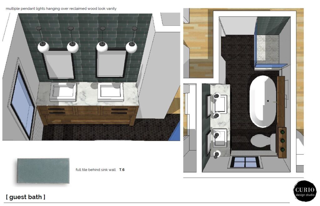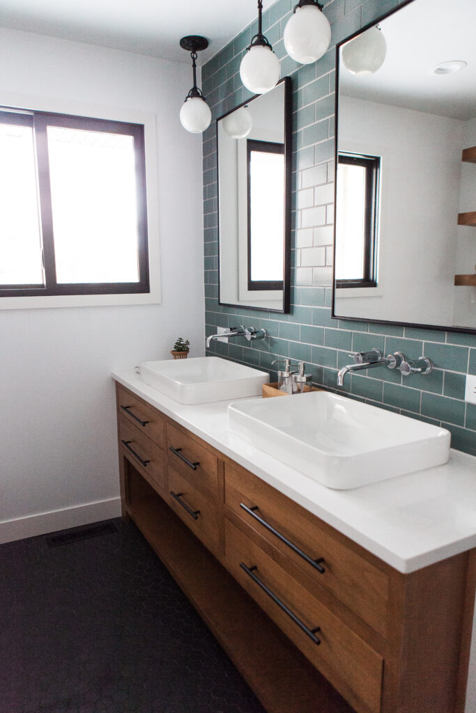 Material selections were kept sleek + simple. A matte black hexagon for the floor, warm wood vanity style with marble-look quartz and chrome plumbing fixtures. The main focal point of the space was the amazing teal tile that runs the full wall behind the sinks. Classic subway tile, off-set by wood trim and black accents completes the space the rest of the space.