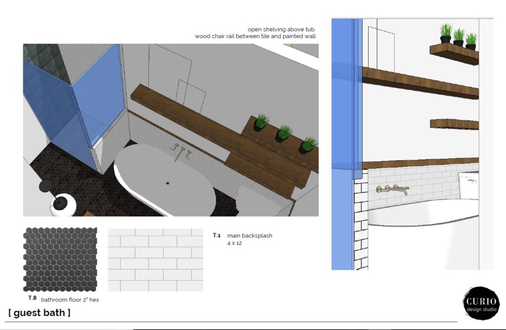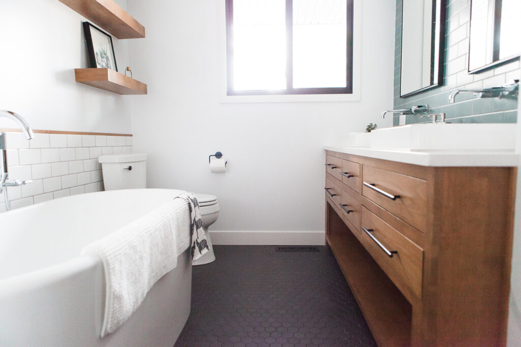 For added storage and a design feature element we created custom floating shelves on the wall above the tub. Not only is this a great (+ decorative) way to store needed toiletry items, it also connects back to the material of the wood vanity.