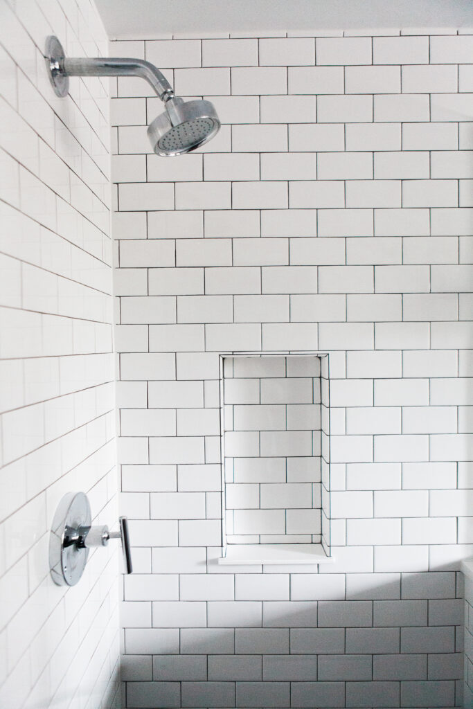 Last, we busted out the shower. Previously this was drywalled and tiled on all sides with a small opening to get in. We ditched those walls in favor of seamless glass + a tiled knee wall separating tub and shower