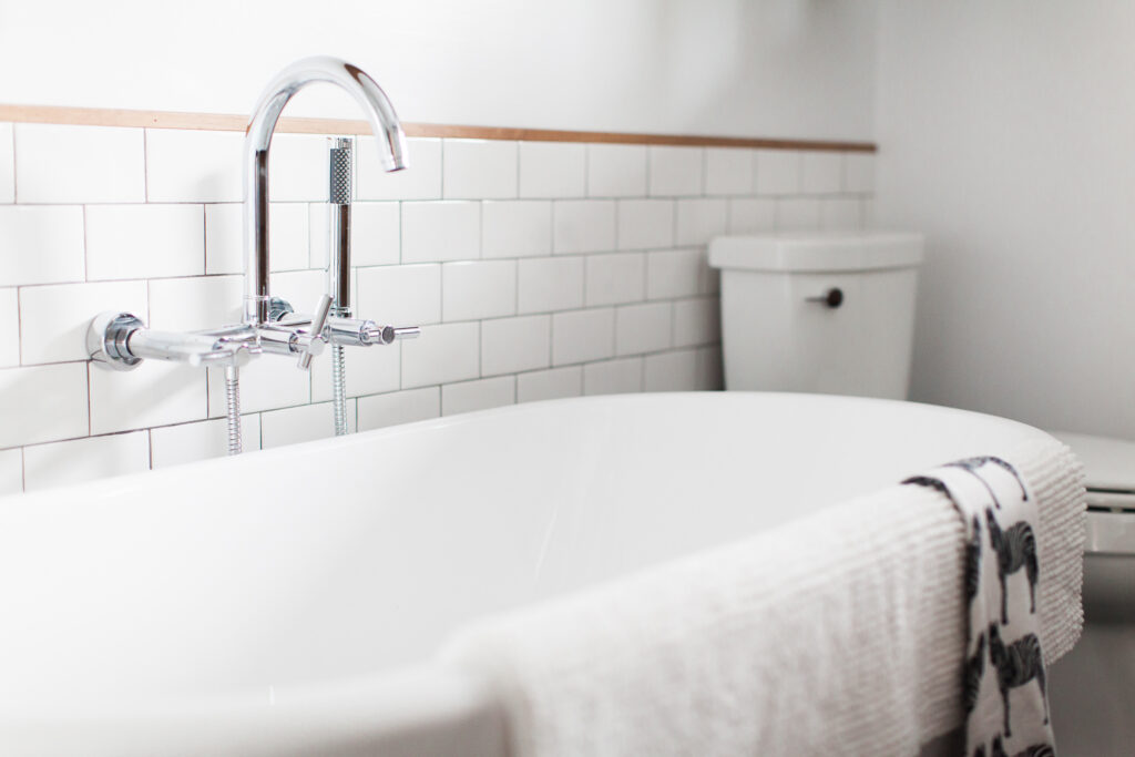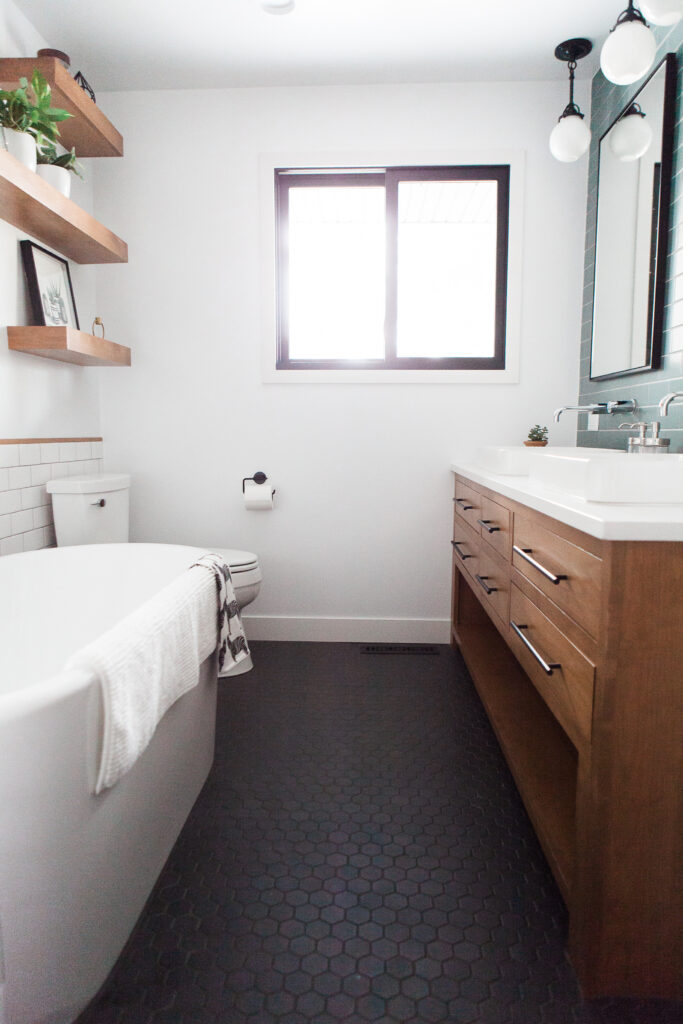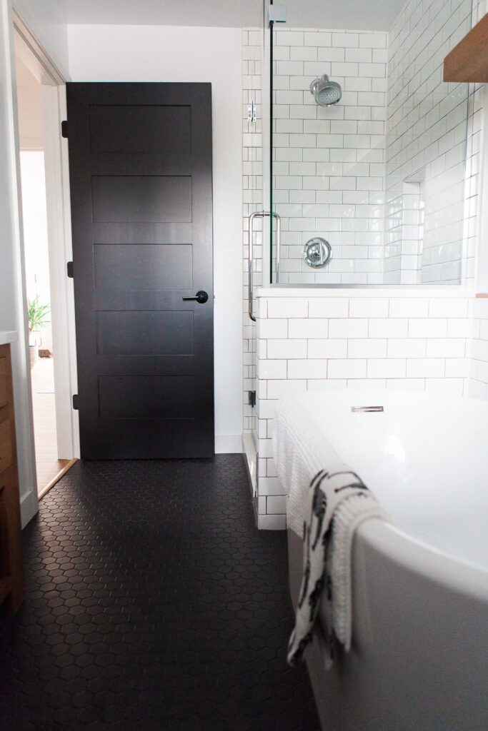 Second, we completely removed the divider wall between tub and toilet, opting instead for a freestanding tub and more visually open space.