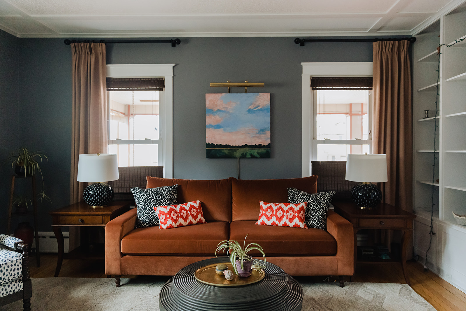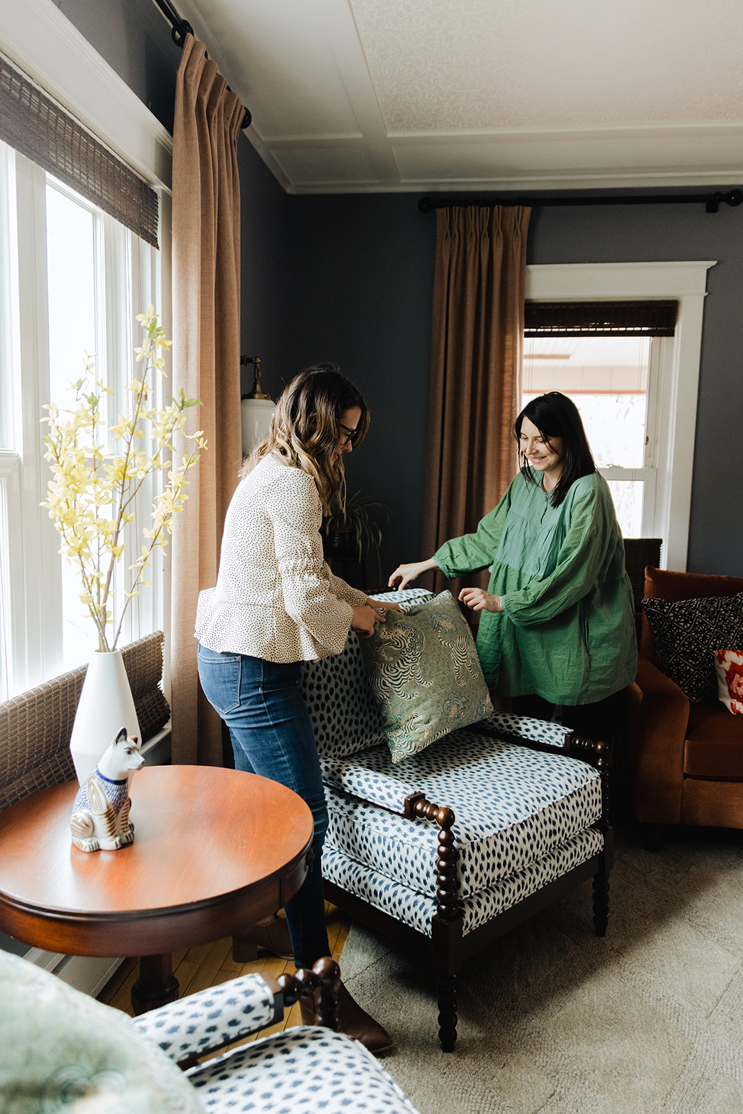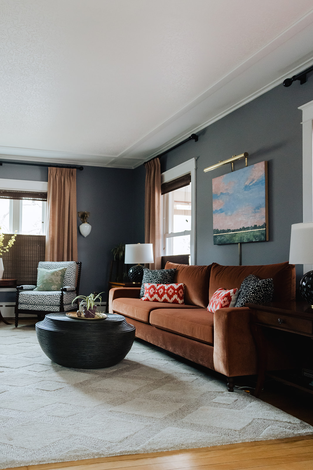 The living room plan was all about layers. Working with a few of their existing pieces and existing wall color we added textiles and furniture to elevate the space. New sofa and armchairs gave them a comfortable space for conversing, and window treatments and a wallpapered ceiling helped amplify the natural height of the space.