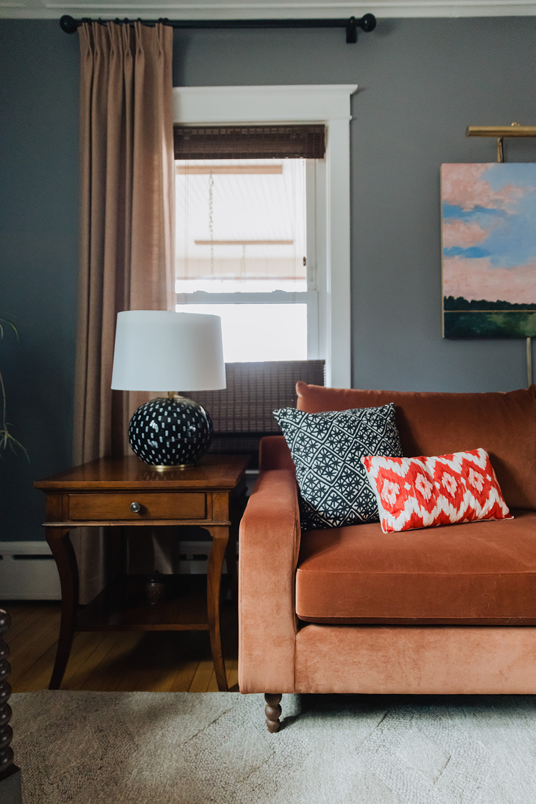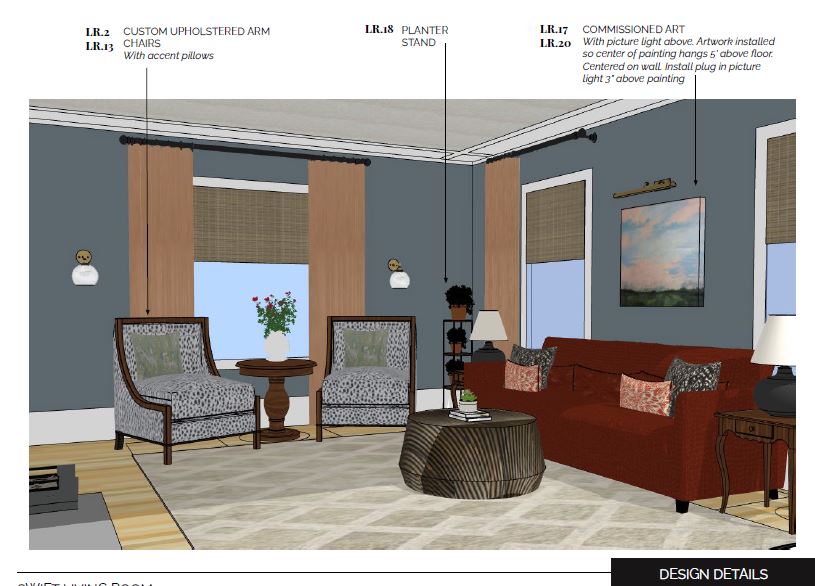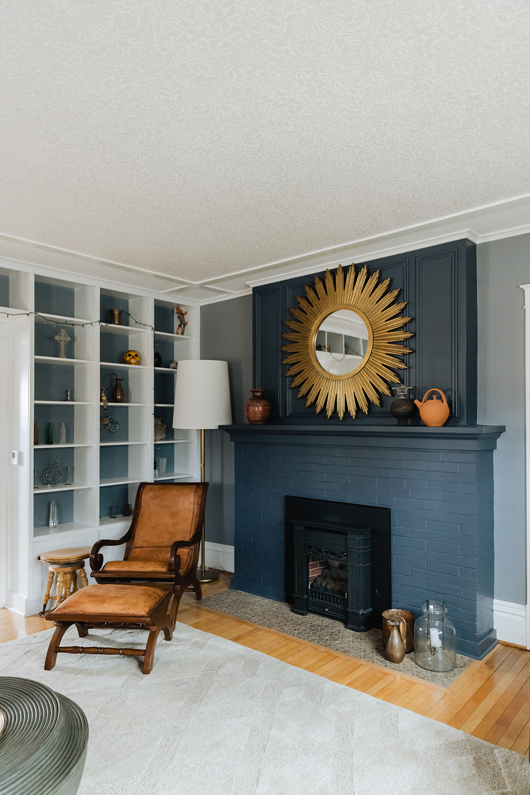The living room plan was all about layers. Working with a few of their existing pieces and existing wall color we added textiles and furniture to elevate the space. New sofa and armchairs gave them a comfortable space for conversing, and window treatments and a wallpapered ceiling helped amplify the natural height of the space.