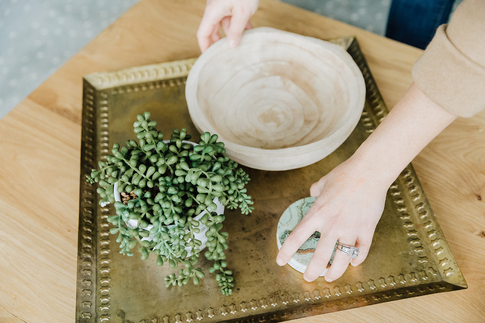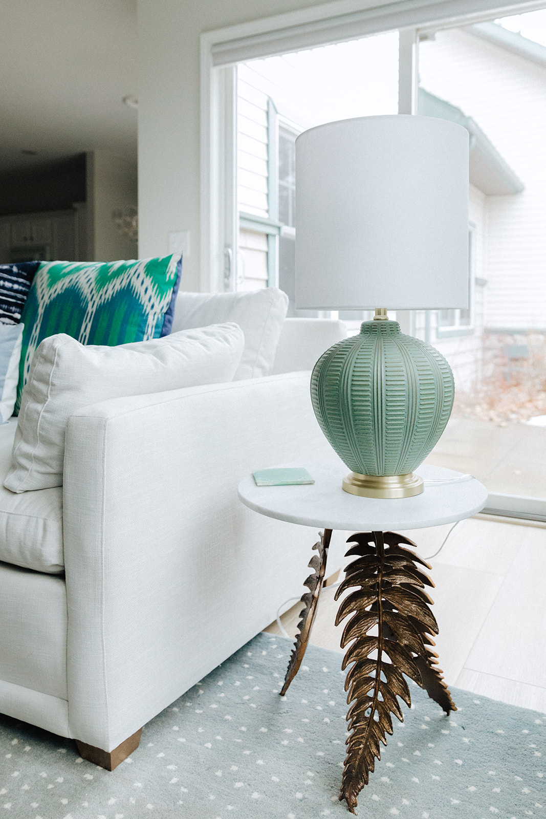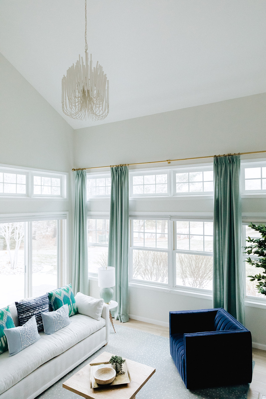 For furniture we planned first to create a more neutral base in the condo by painting everything a subtle color as well as replacing the flooring with a bleached oak look LVT. On top of that we planned to layer textured pieces of furniture with warm wood and brass details. Several shades of blue and green were used throughout to create an upscale coastal vibe.