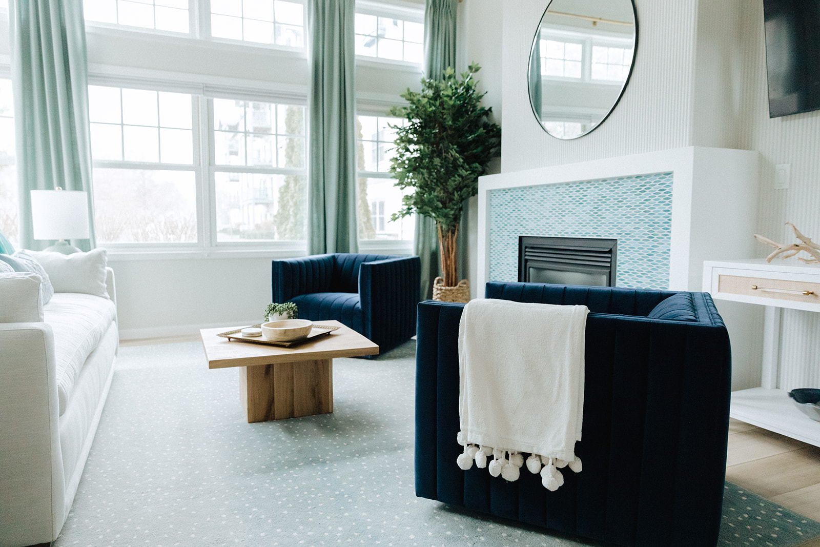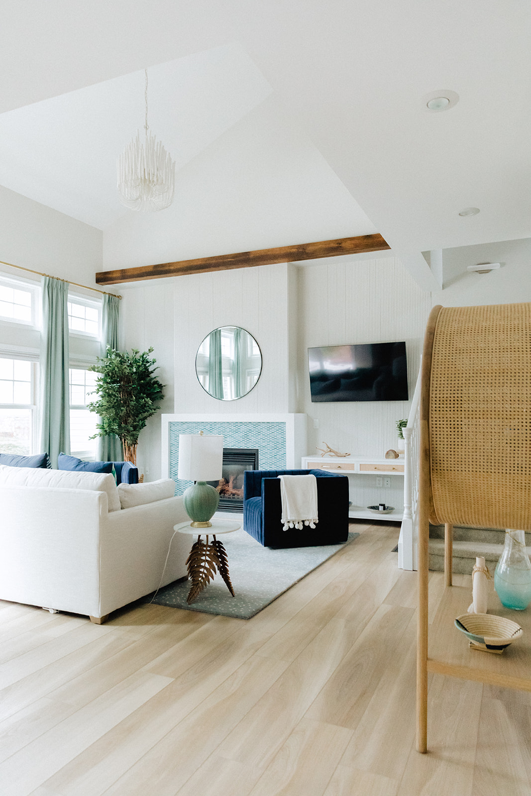 While this space was relatively new (compared to a lot of the early 1900’s homes we work on) it was definitely a bit lackluster. The client wanted to create a space that felt light, bright, and beachy…but was hoping for a more elegant and modern approach to “lakehouse”. She was struggling with the asymmetrical fireplace that became an awkward focal point in the space and made ideal TV placement tricky.