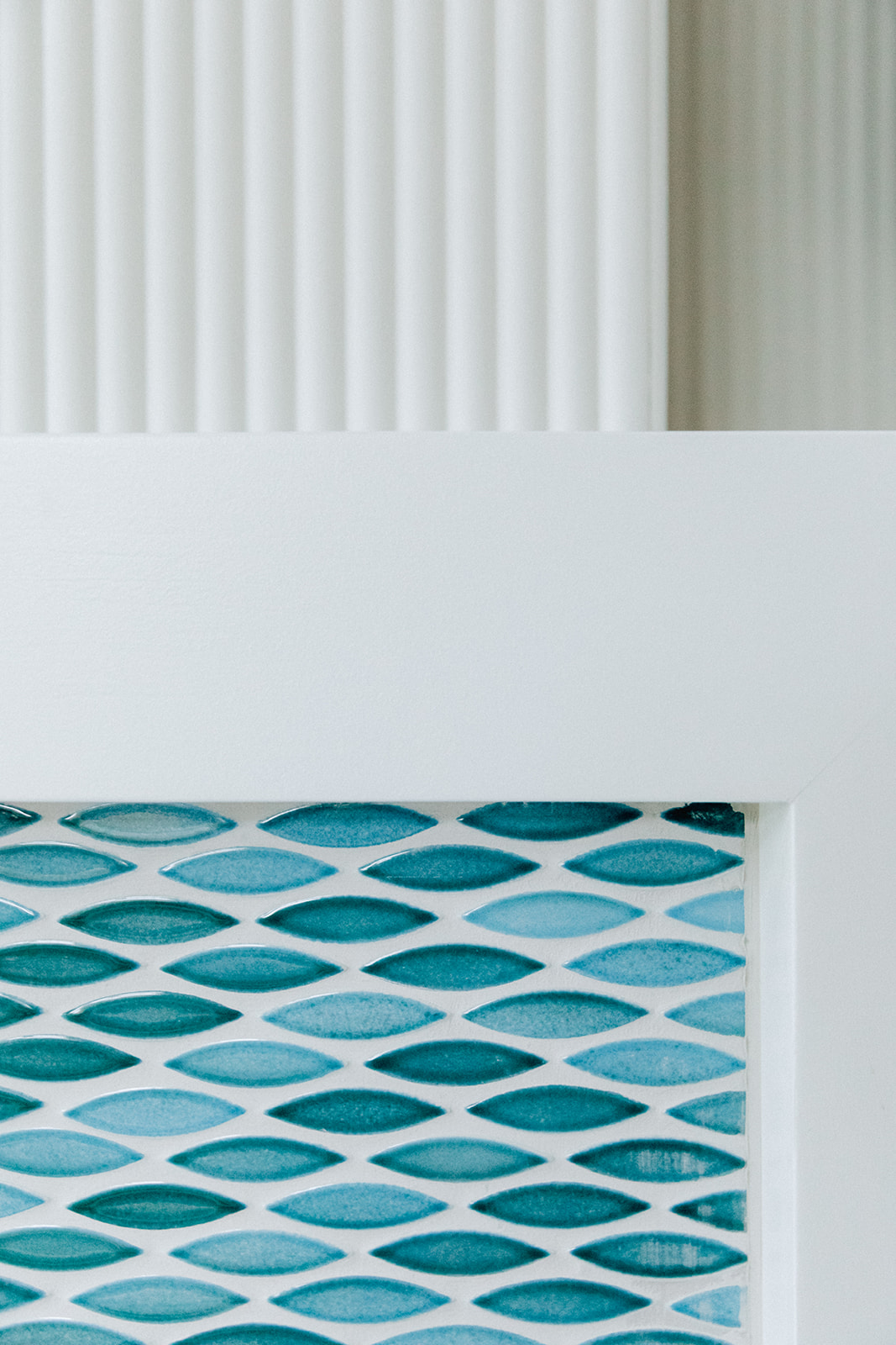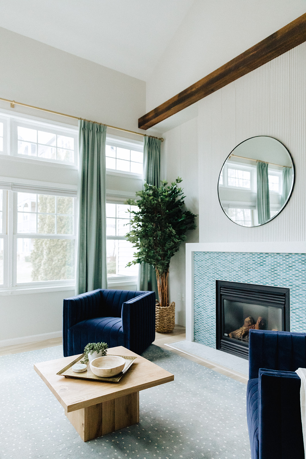 Our biggest challenge in this space was addressing the fireplace wall. We opted for a subtle focal point by paneling the entire wall in tambour paneling and painting it all the wall color. We created a custom faux beam to go across the length the entire wall to create some unity between the different sections. We modernized the mantle by creating a streamline waterfall piece and inlaying a brightly colored tile inside of it.