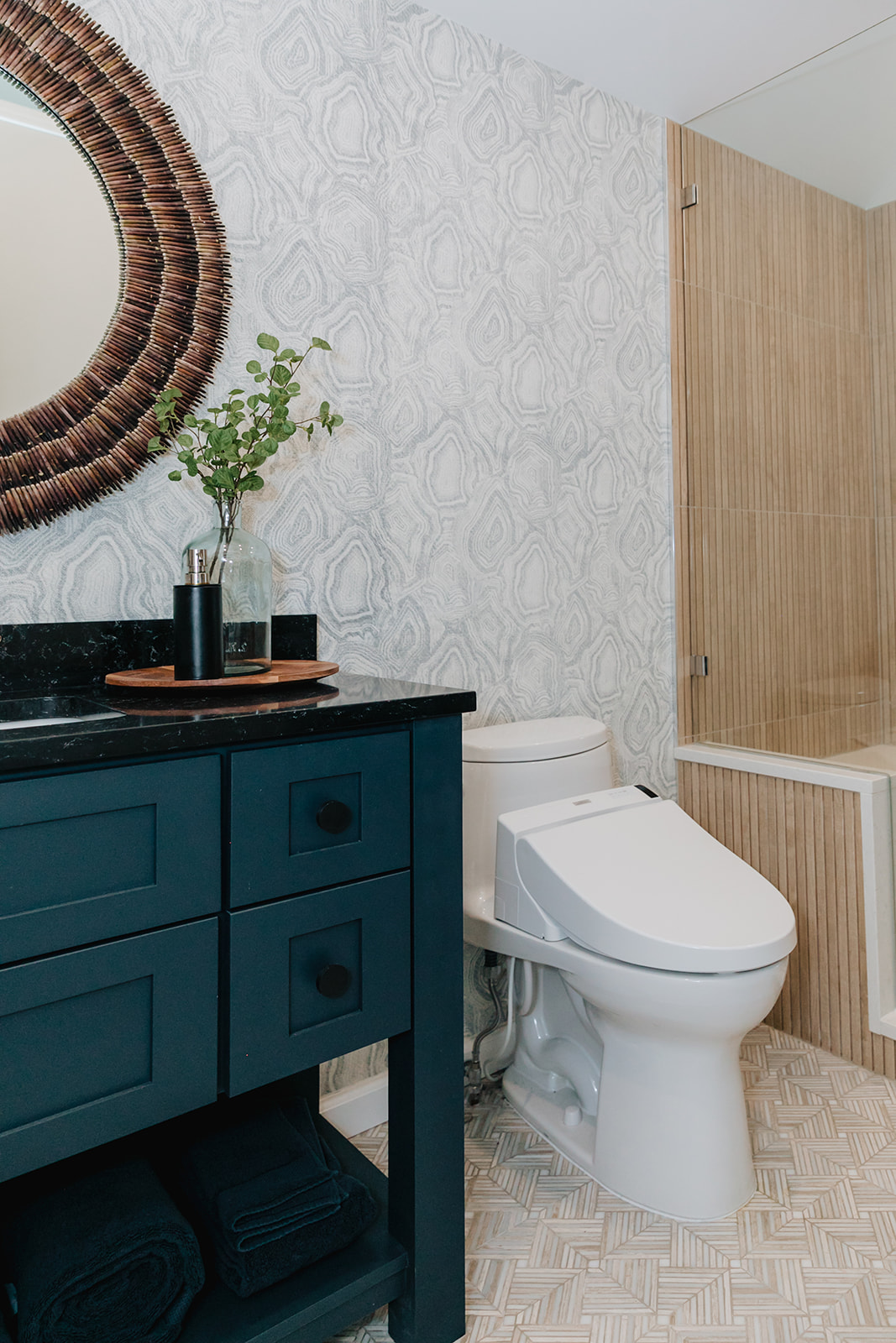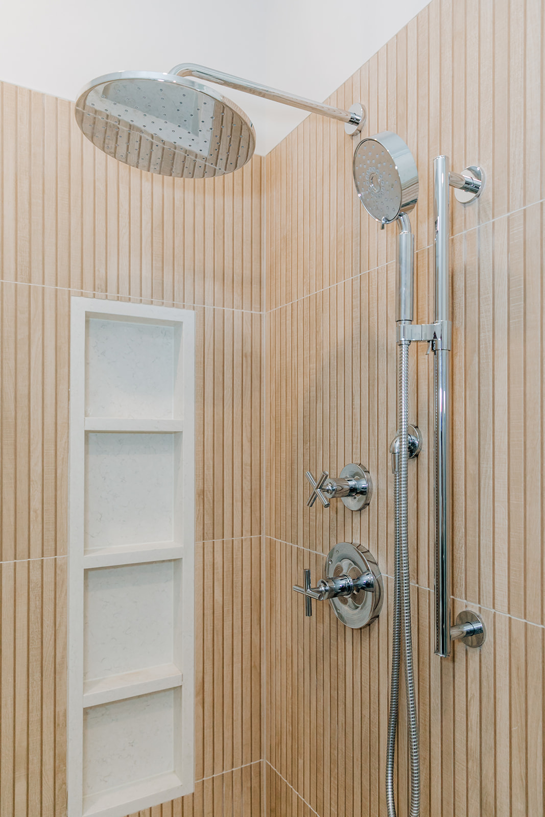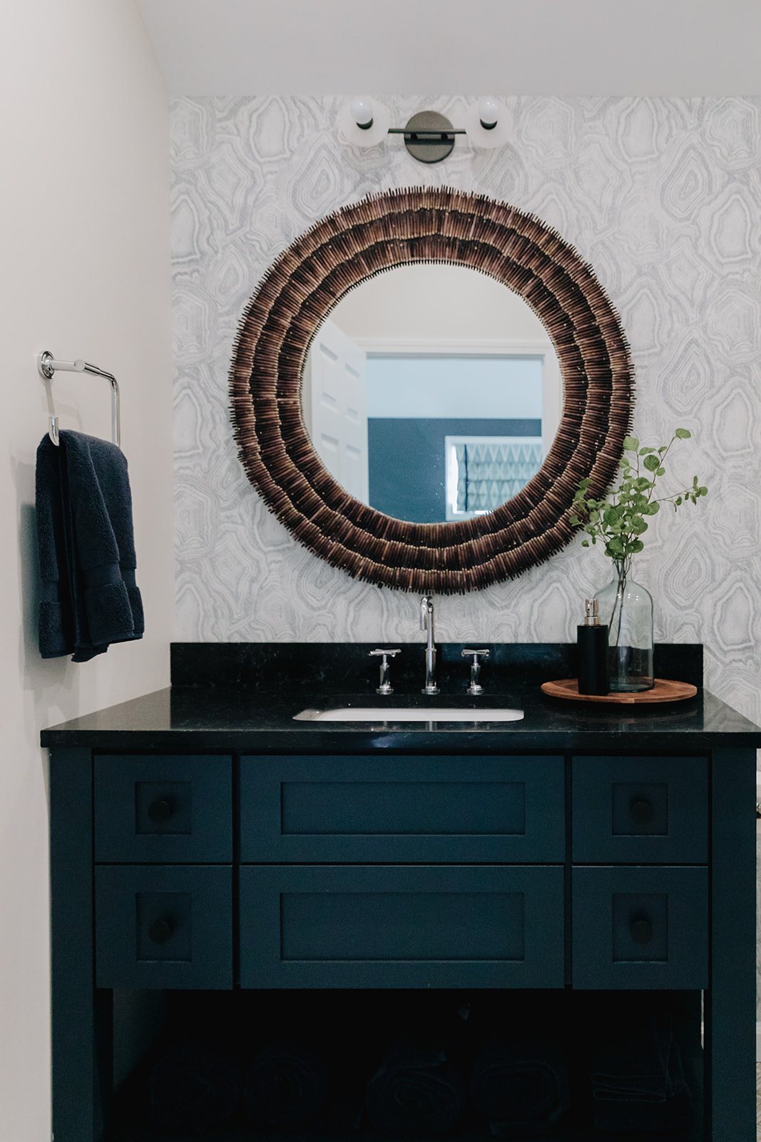 We carried in some of the same finishes from the first level master— bringing in a dark vanity with dark quartz top topped off with a amazing textured mirror. The rest of the finishes went light and neutral to balance out that bold selection. Our favorite part of this entire space is the grooved wood look tile that flanked the entire shower. We mixed a few types of tile (geometric + organic) for the main floor and shower floor and finished off the space with sleek chrome plumbing fixtures.
