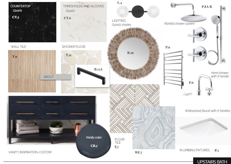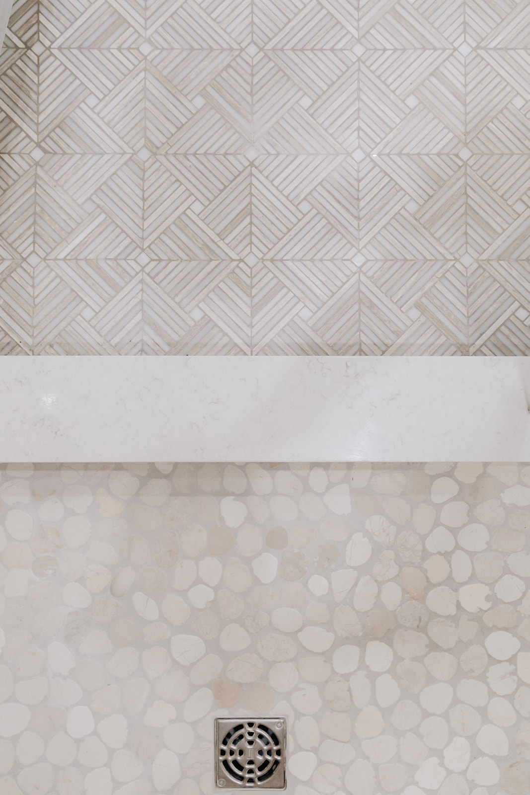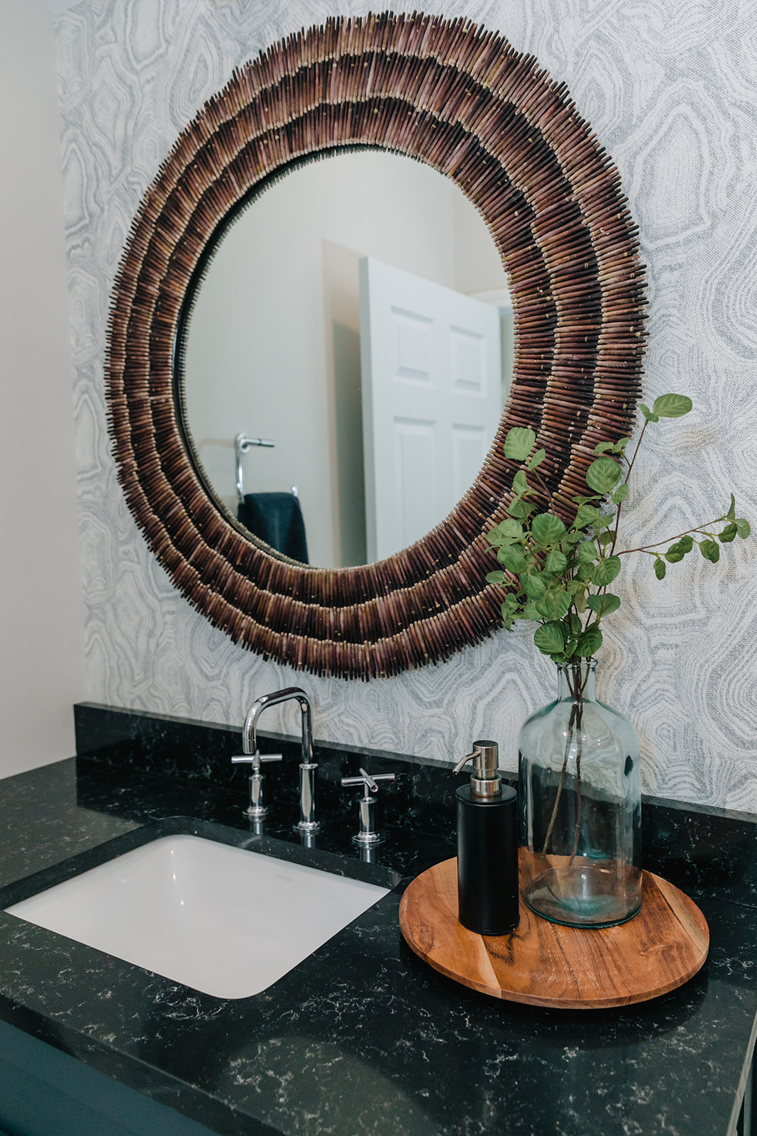 We carried in some of the same finishes from the first level master— bringing in a dark vanity with dark quartz top topped off with a amazing textured mirror. The rest of the finishes went light and neutral to balance out that bold selection. Our favorite part of this entire space is the grooved wood look tile that flanked the entire shower. We mixed a few types of tile (geometric + organic) for the main floor and shower floor and finished off the space with sleek chrome plumbing fixtures.