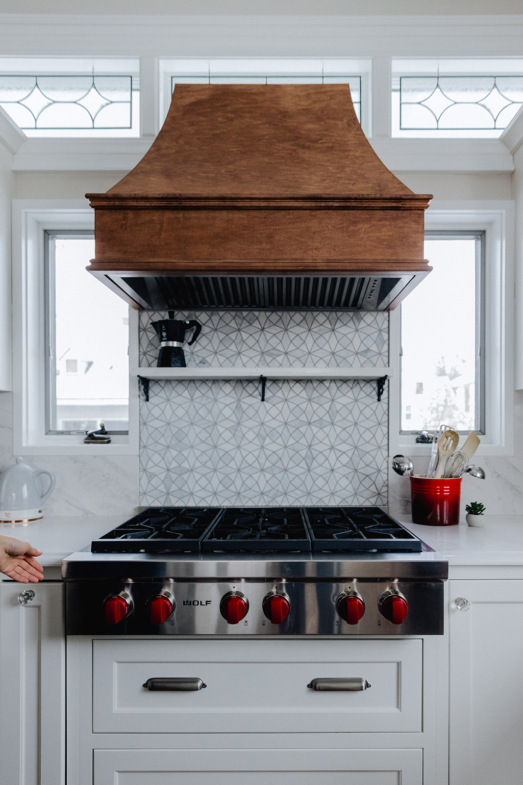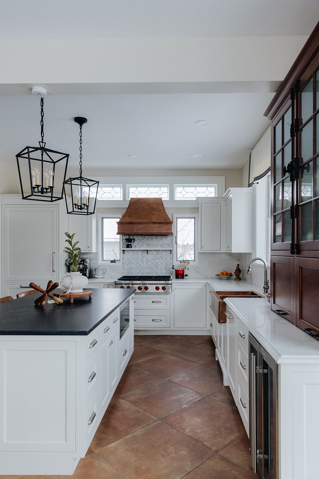 A crisp white kitchen, with pops of cherry wood, copper and black. The original intent was to give them a cream and terracotta checkerboard floor but we had ALL kinds of issues with supply on the tile and ultimately had to go with all terracotta but kept the tile oversized and installed on a bias.