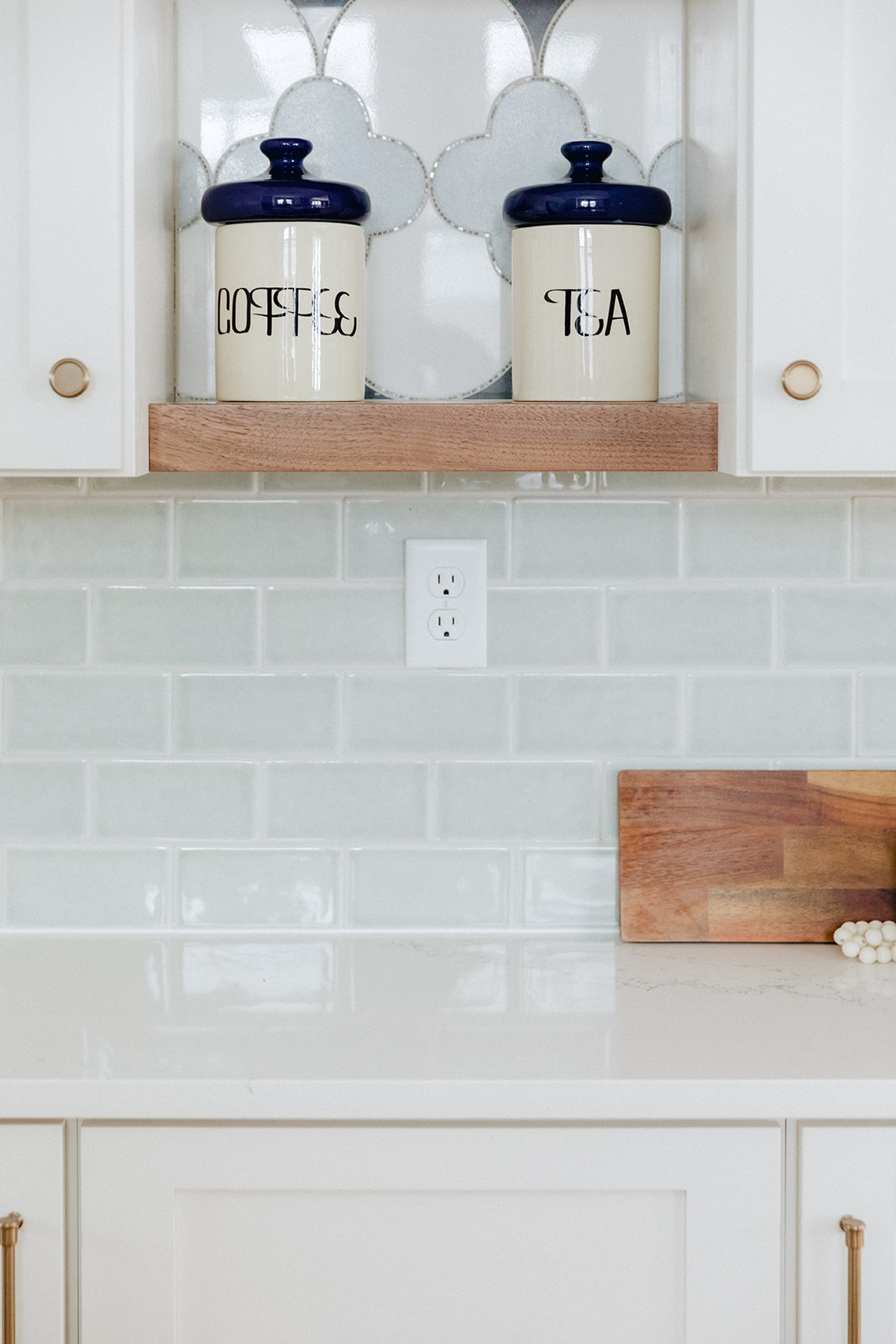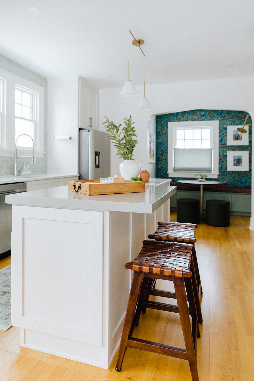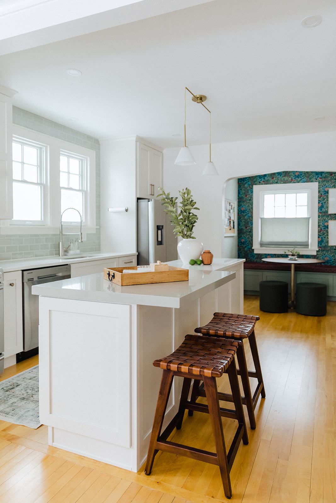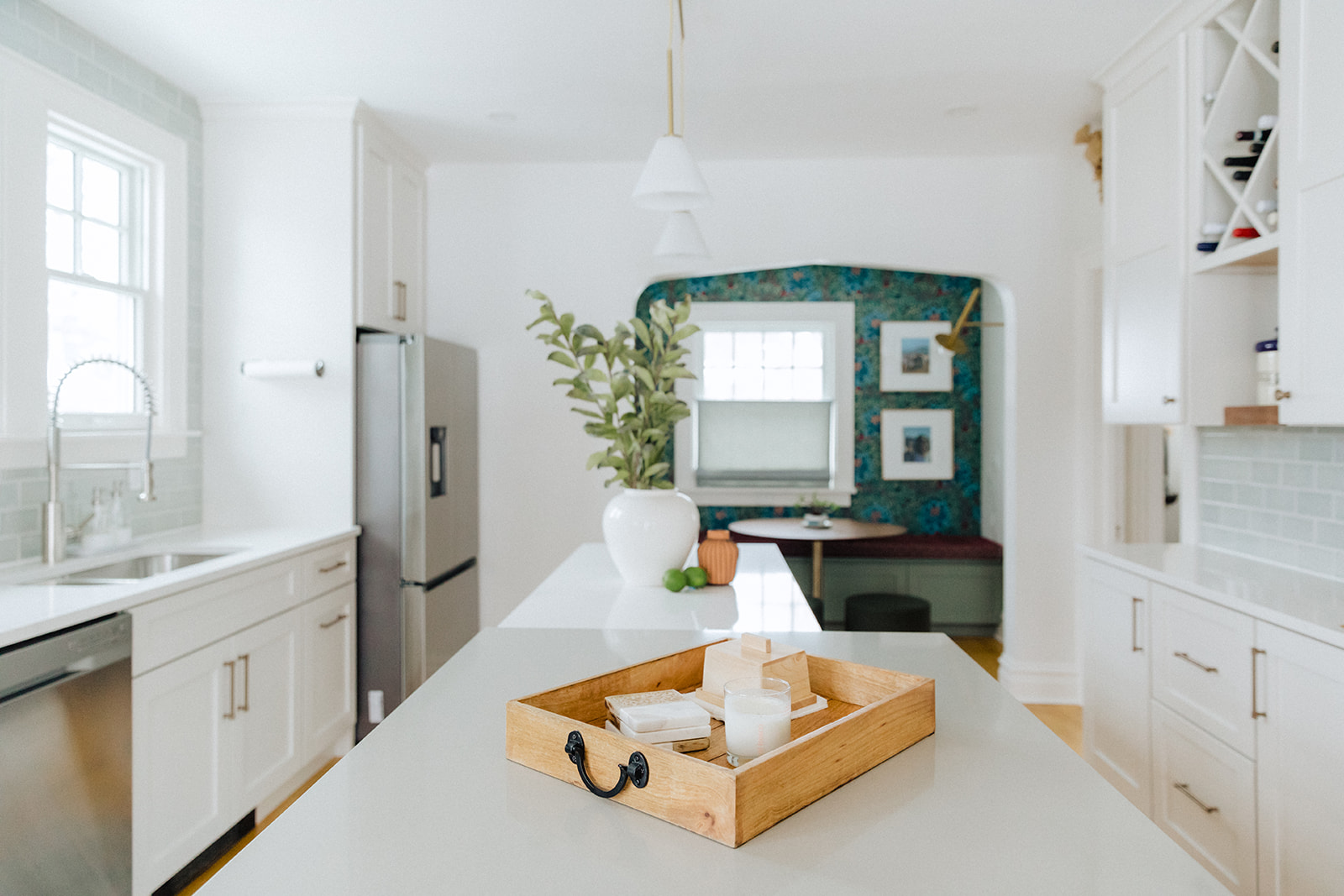 We are generally big fans of bold color, so we had to really restrain ourselves to come up with a more subtle and timeless scheme. Soft neutral cabinets and walls and bright white stone set the backdrop for a few moments of bolder color and pattern. Of course we are talking about that breakfast nook. We re -built the archway to give a more decorative look (which matches other arched details in the house) and packed all our color into that cozy space.