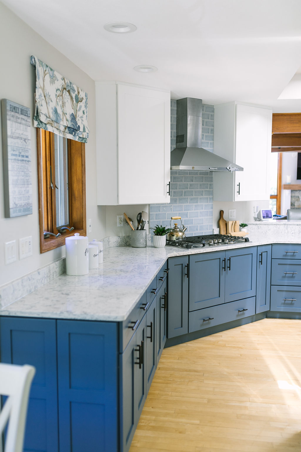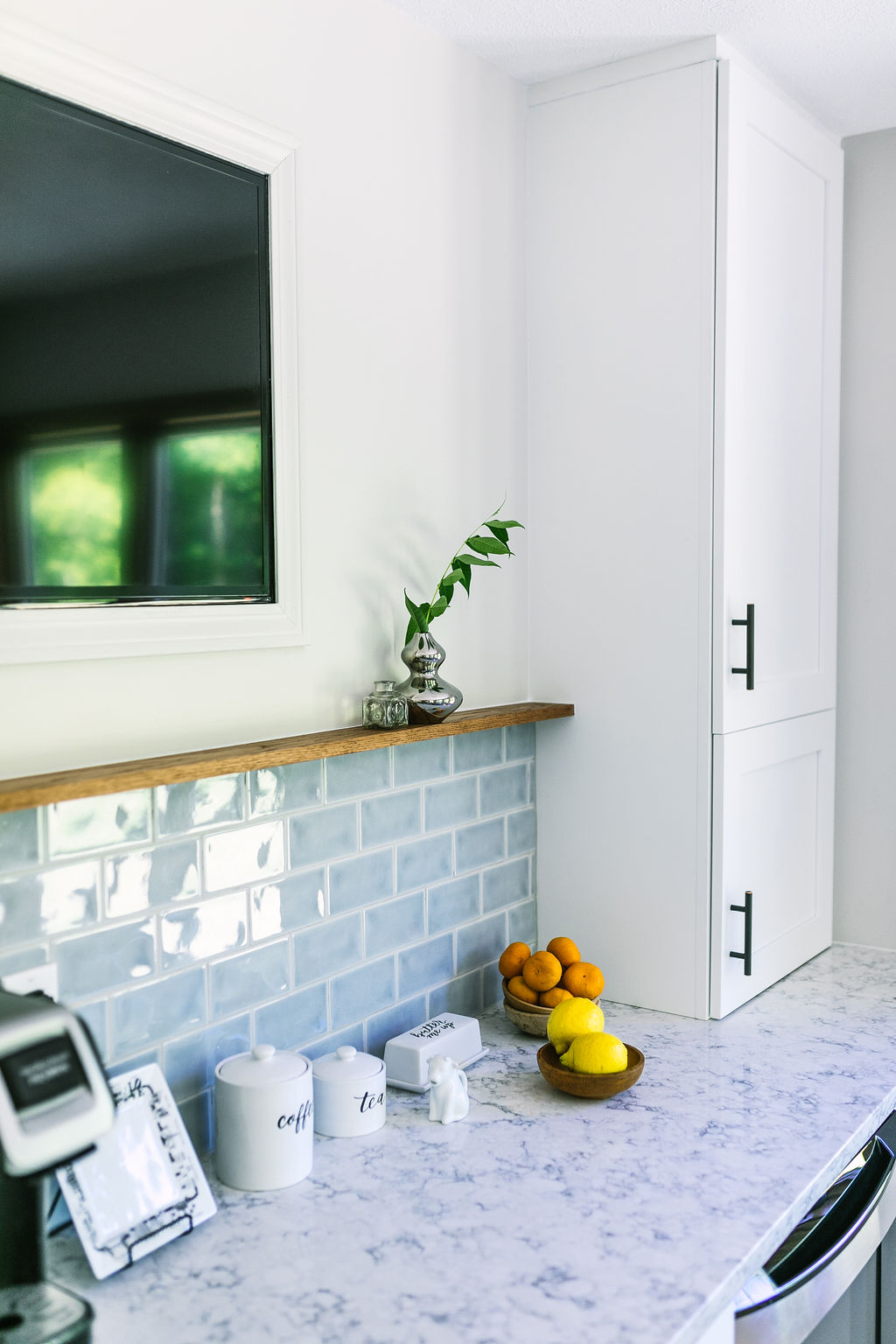 We utilized the existing base cabinets and had them refinished and refaced. We added a bank of cabinets in the breakfast room to create more functional storage and additional appliance space. We brought in a light blue subway tile in the breakfast room and capped it off with a wood pill shelf to help tie it into some of the other pieces of wood trim throughout the house.