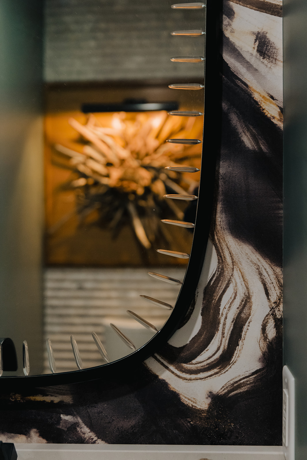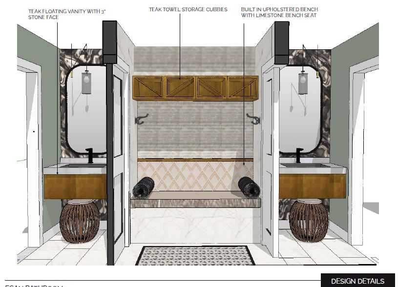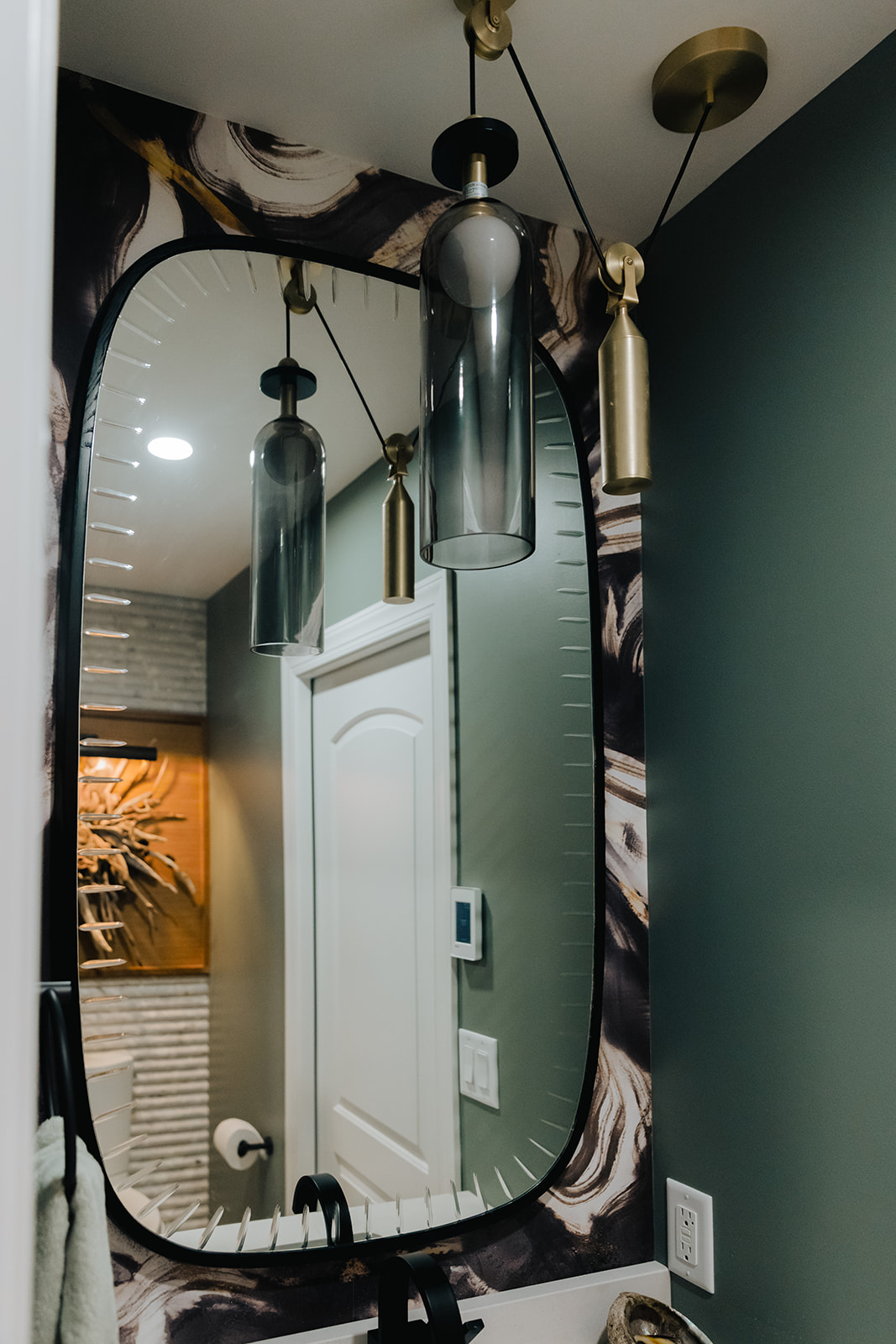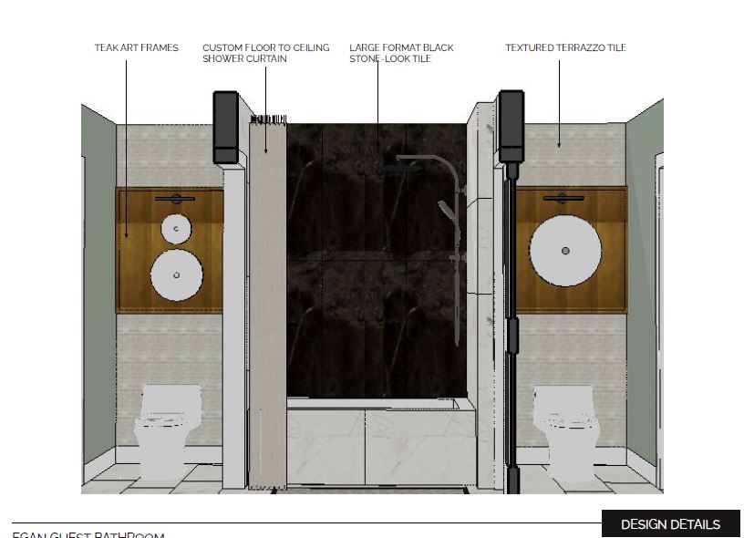 Symmetry was the name of the game. Making both sides of the bathroom mirror each other with a great tub room in the center. We also tried to mix in as many textures and unique elements as we could.  The closer you look at the design the more details you notice. From the texture around the edge of the mirror glass down to the bobble trim on the shower curtain edge.