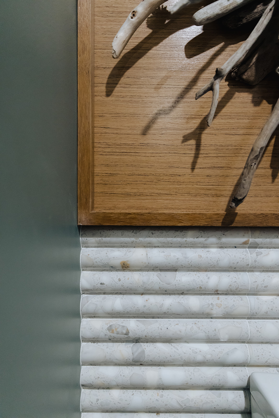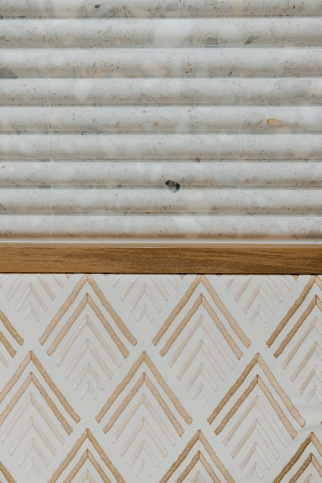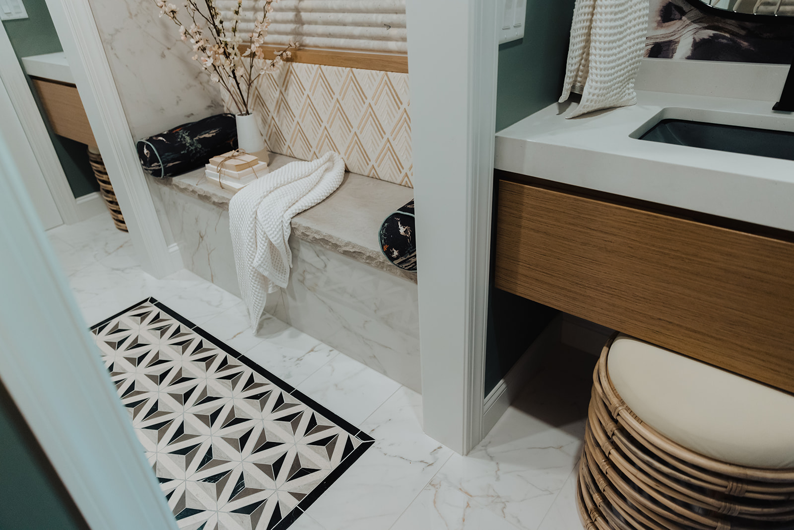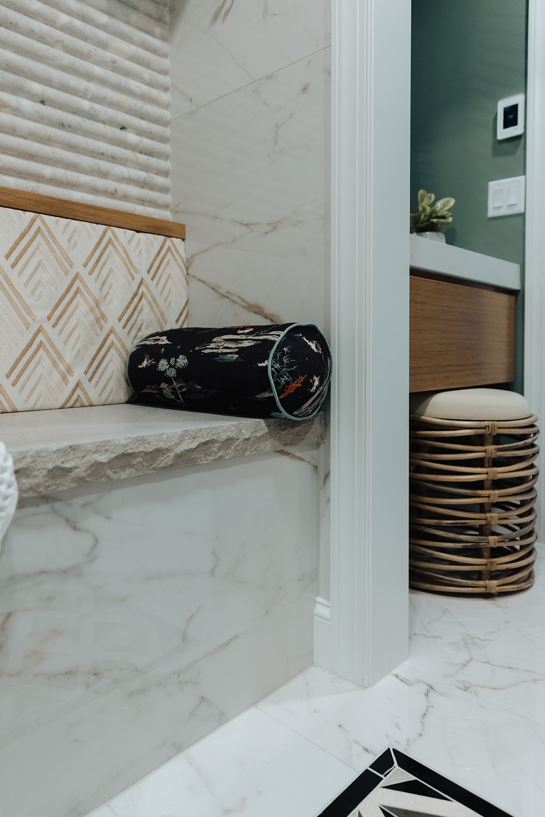 After going through our standard design + build process  (meet, design, revise, finalize) we head into construction. This project included amazing work from other local craftspeople (custom stone bench top, custom Vanity and wood elements from JT Olson, custom upholstery and pillows) paired up with Curio Custom to put it all together (including some amazing tile work–check out those miter edges! )