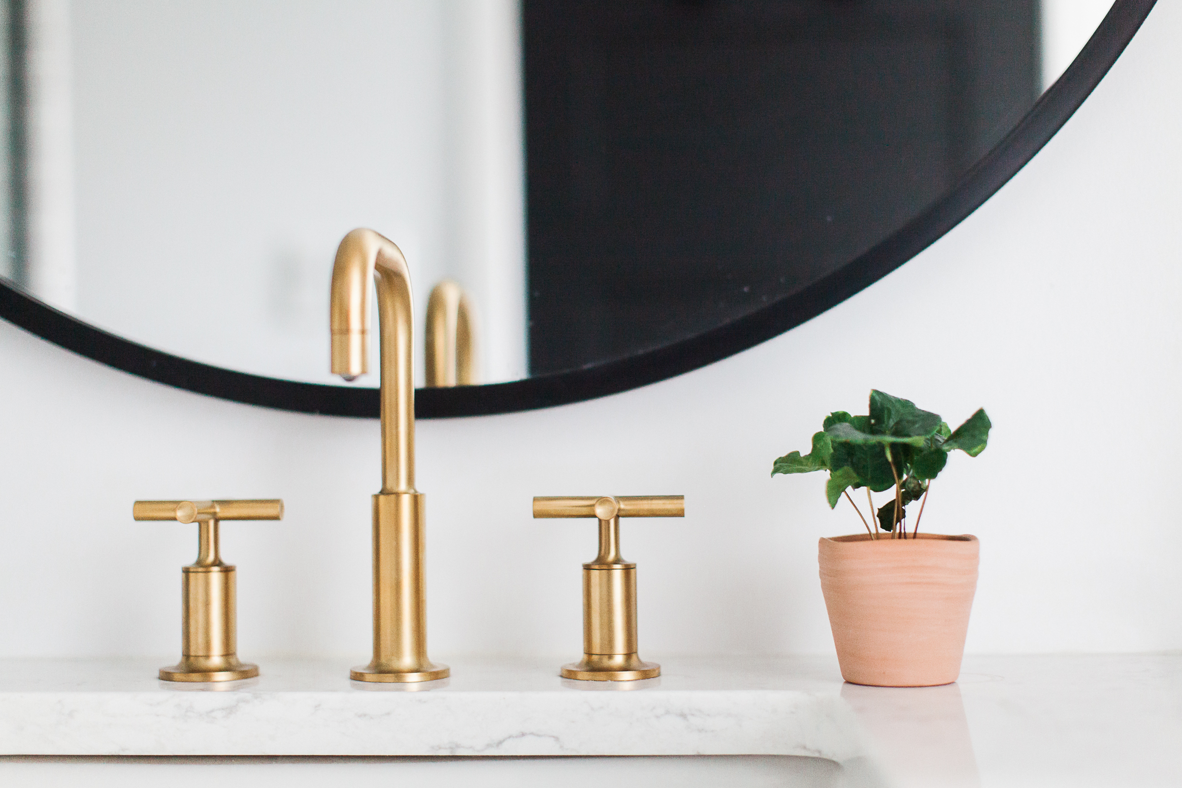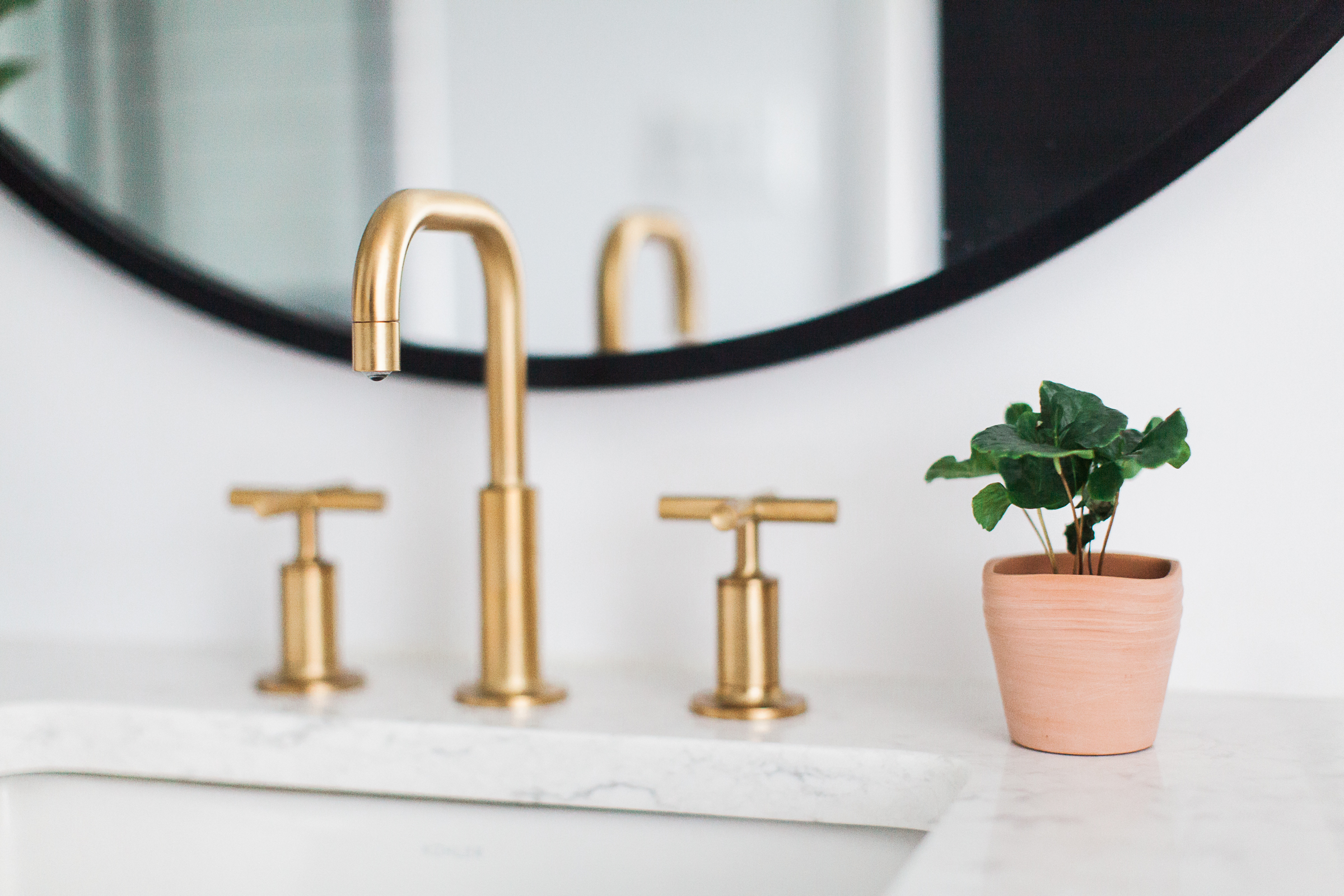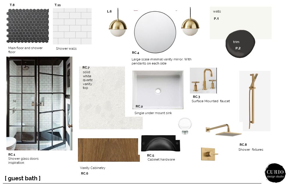 The bathroom connects to the rest of the house through color palette and the clean line selections. The tile finishes are super simple– classic subway tile with dark grout combined with a matte black hex in a 3″ size. Similar to the two other baths, we did a custom Alder vanity with brass kohler sink faucets. All these simple finishes are the perfect backdrop for a custom glass shower door with black grids.