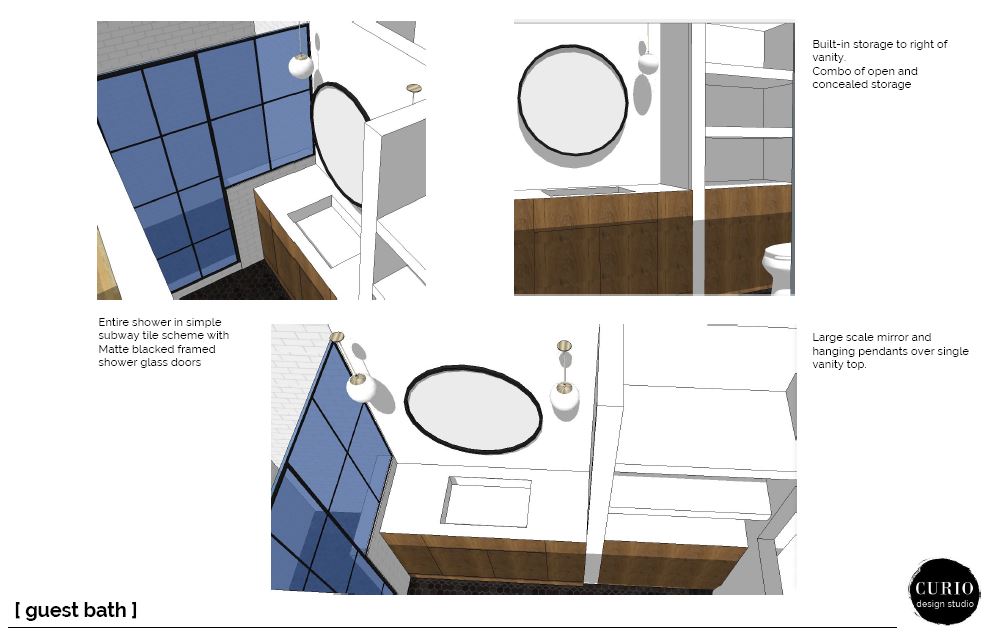 This was the only bathroom in the house that had ZERO revisions from the design presentation to the installation. Well– I should clarify–we did end up selecting a new light as the original spec was out of stock by the time we went to order and install it. But otherwise this bathroom went from conception to reality with very minimal change.