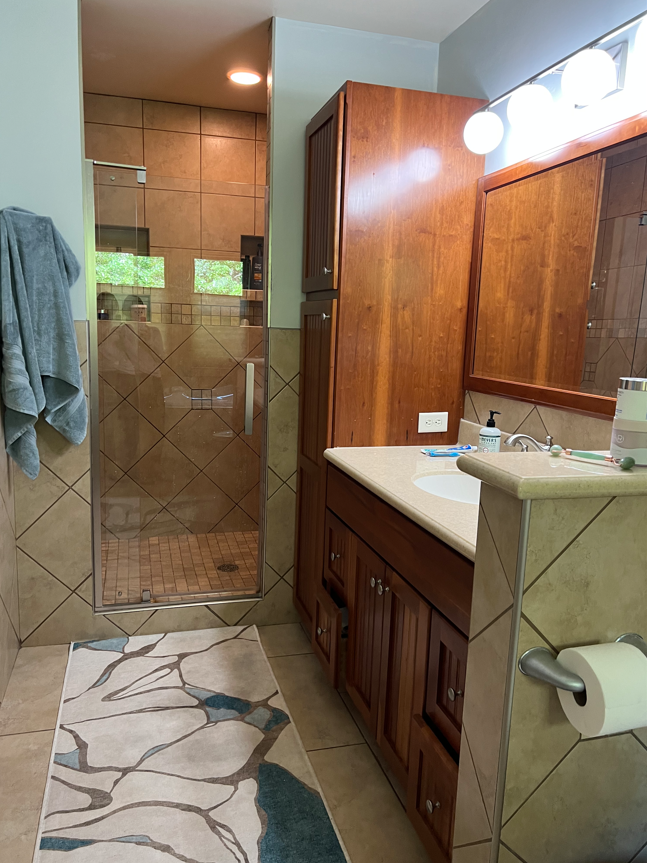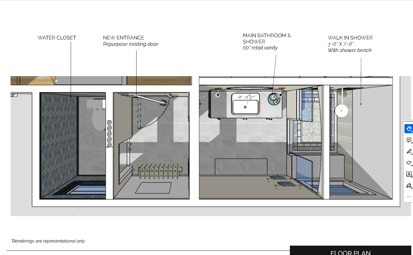 Reconfigure the existing bathroom and extend it into the adjacent bedroom. This required some reconfiguring of doorways and passages to connect the spaces in a way that worked for the flow of all spaces. To utilize the existing plumbing locations and structrual walls the layout evolved into a water closet space with shower and vanity in another room, separated by a small entry hall.