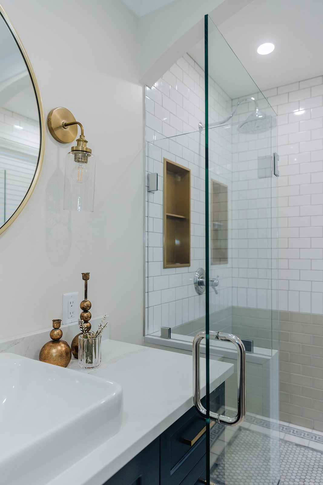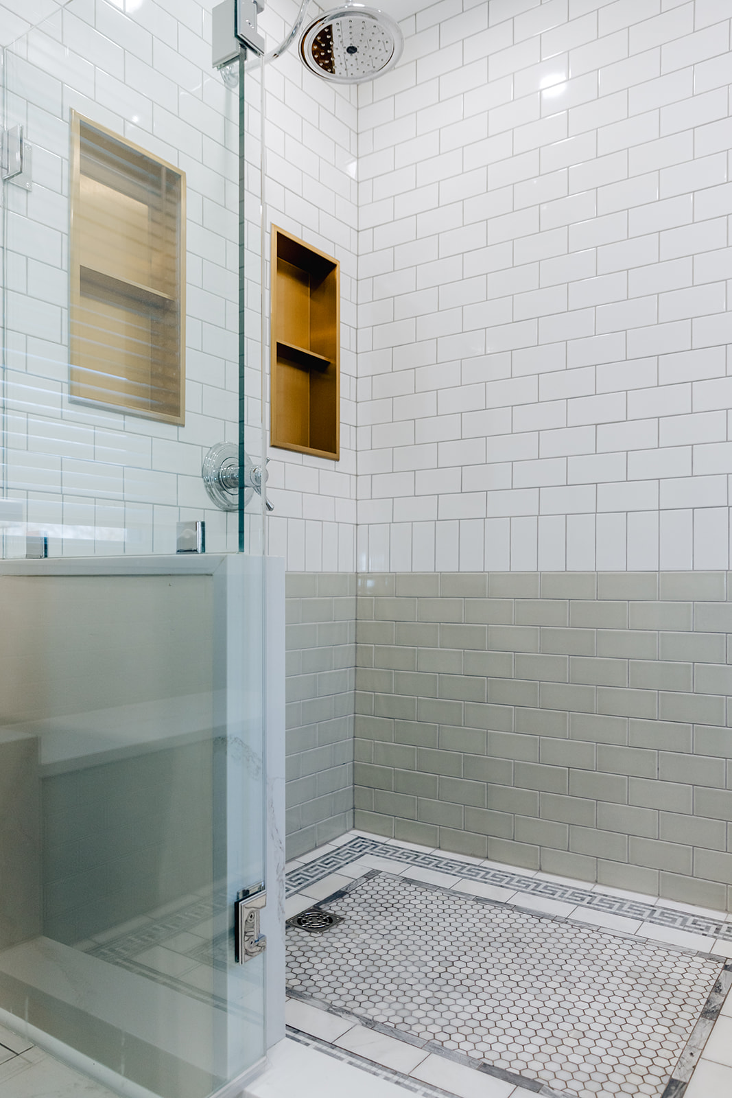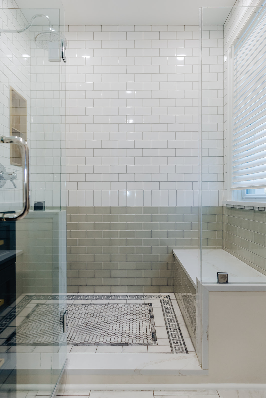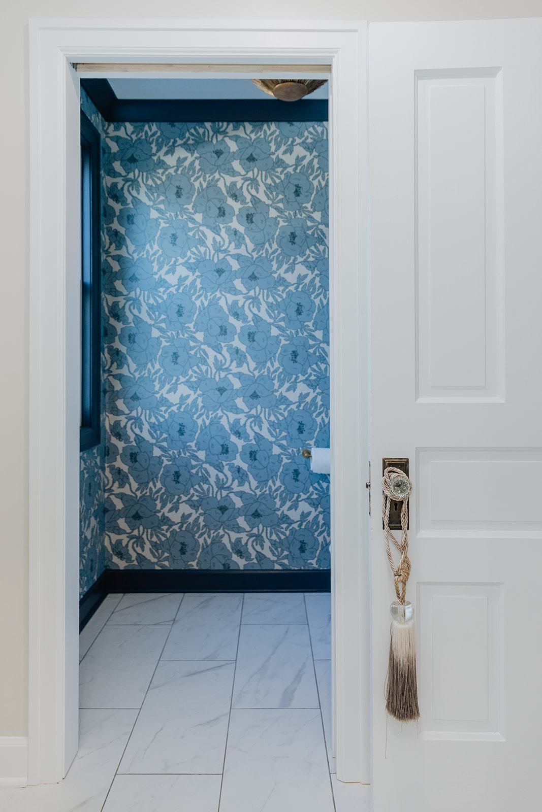 The material scheme was bright, crisp and classic. We opted for packing ALLLLLL the punch into the gorgeous little water closet with fully papered walls and dark blue trim and casing. The shower materials were subtle and elegant with a two tone subway shower and custom marble mosaic floor. Details that feel modern but also reminiscent of the old home this bathroom lives in.