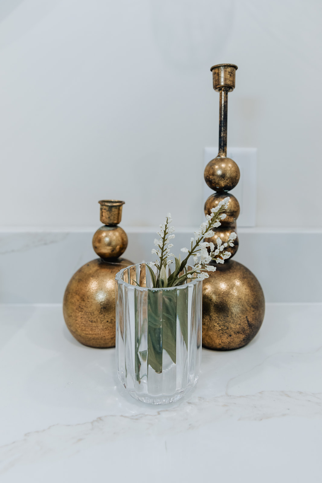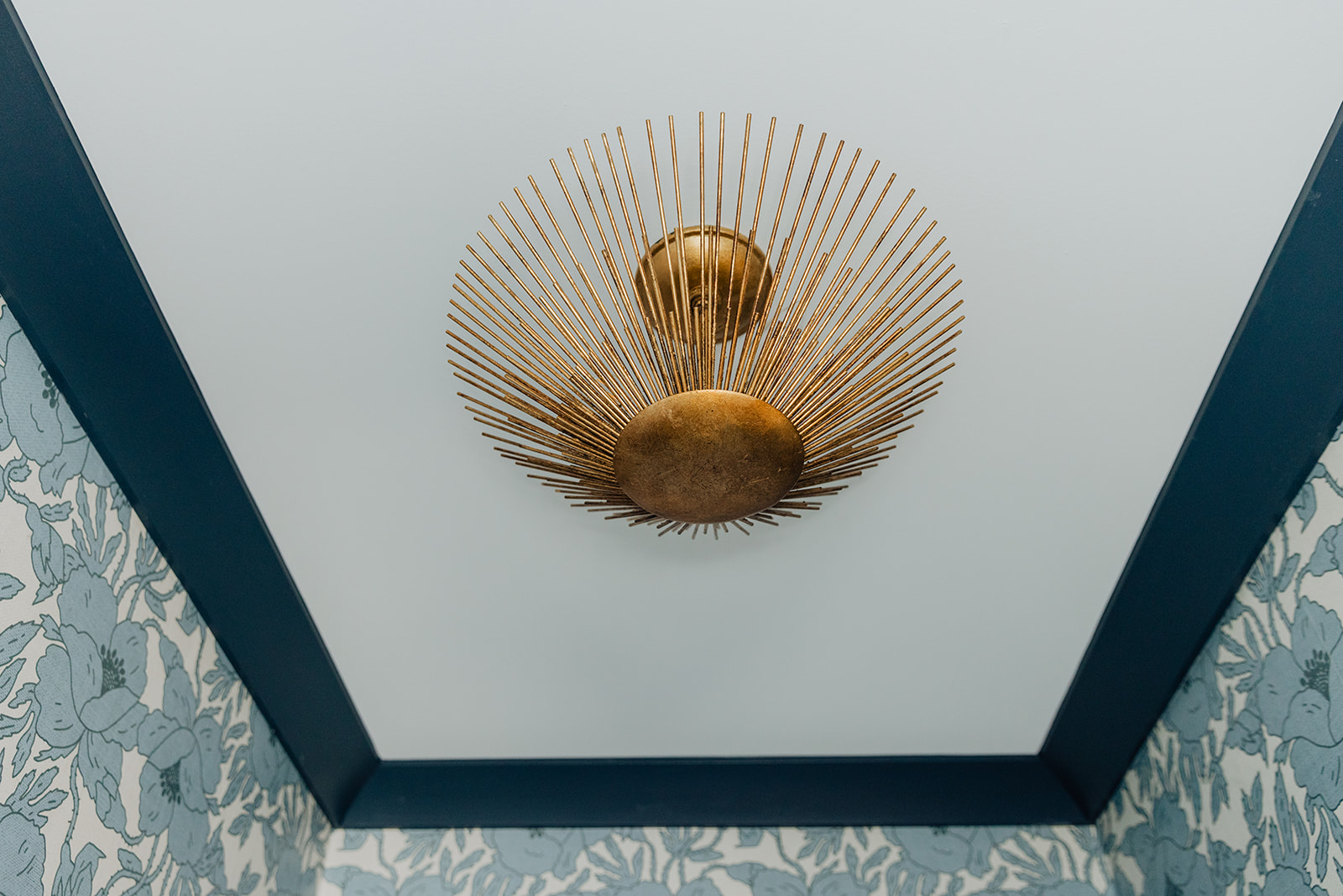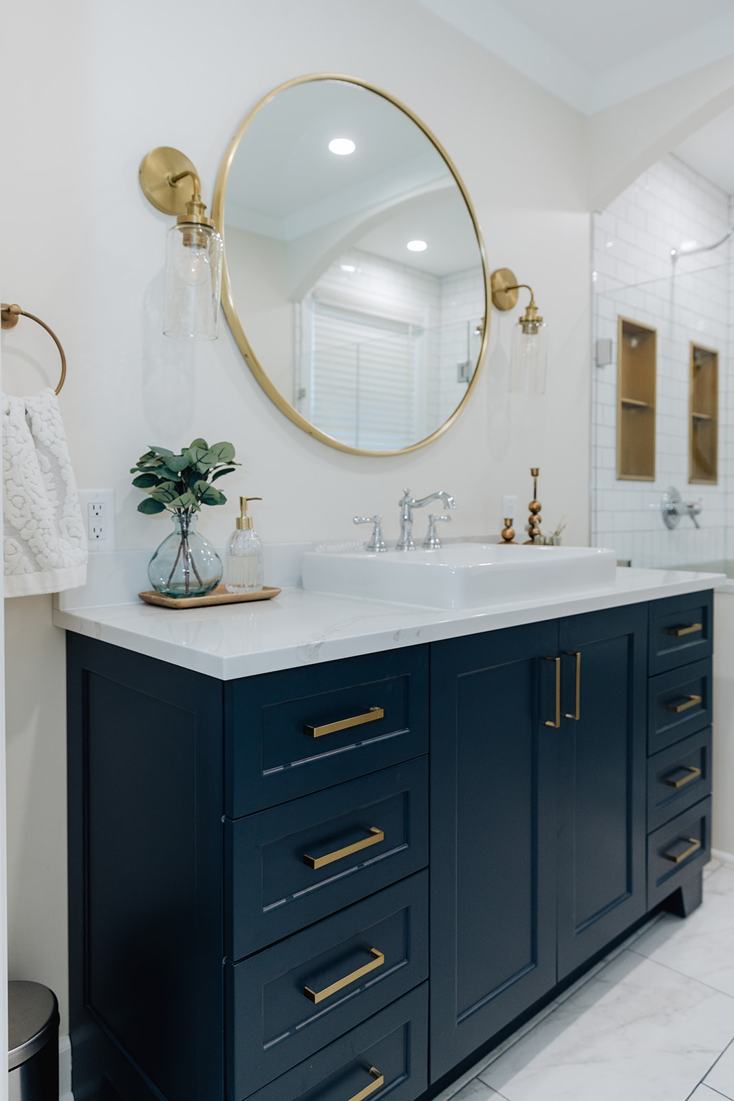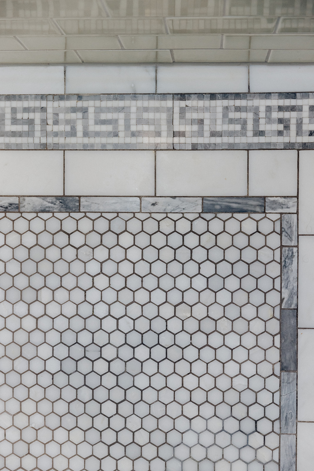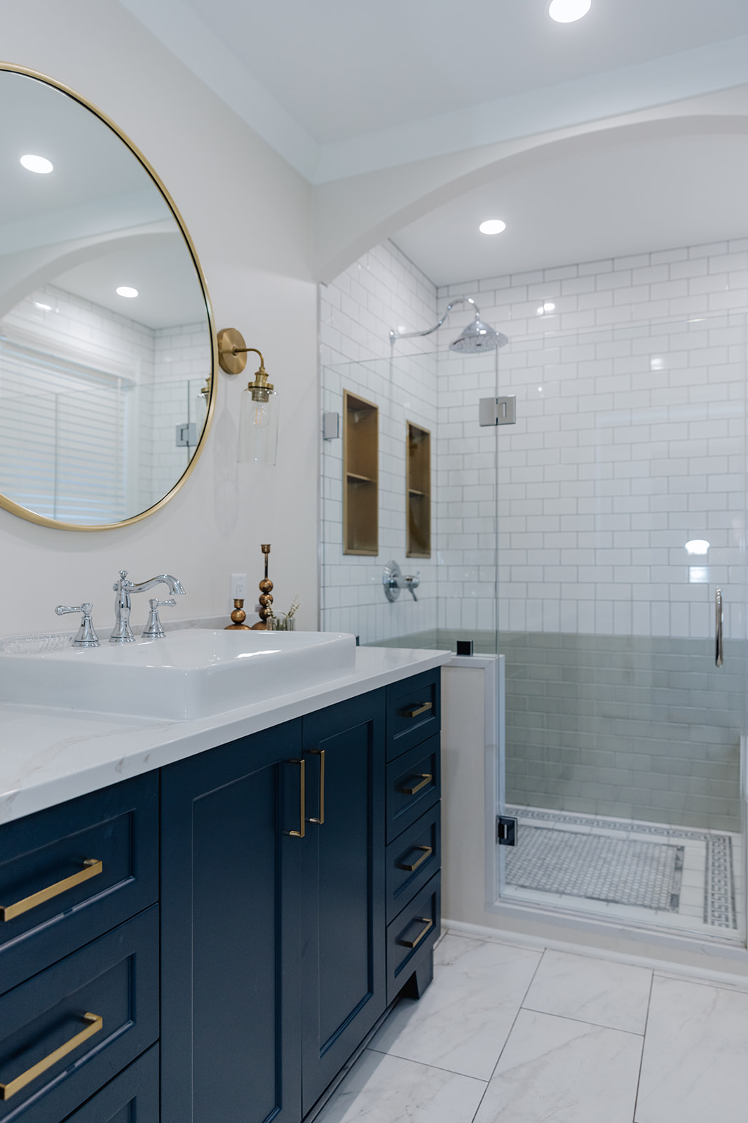 The material scheme was bright, crisp and classic. We opted for packing ALLLLLL the punch into the gorgeous little water closet with fully papered walls and dark blue trim and casing. The shower materials were subtle and elegant with a two tone subway shower and custom marble mosaic floor. Details that feel modern but also reminiscent of the old home this bathroom lives in.