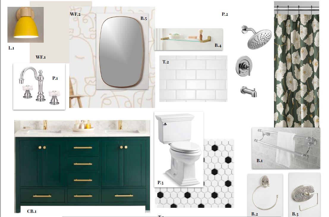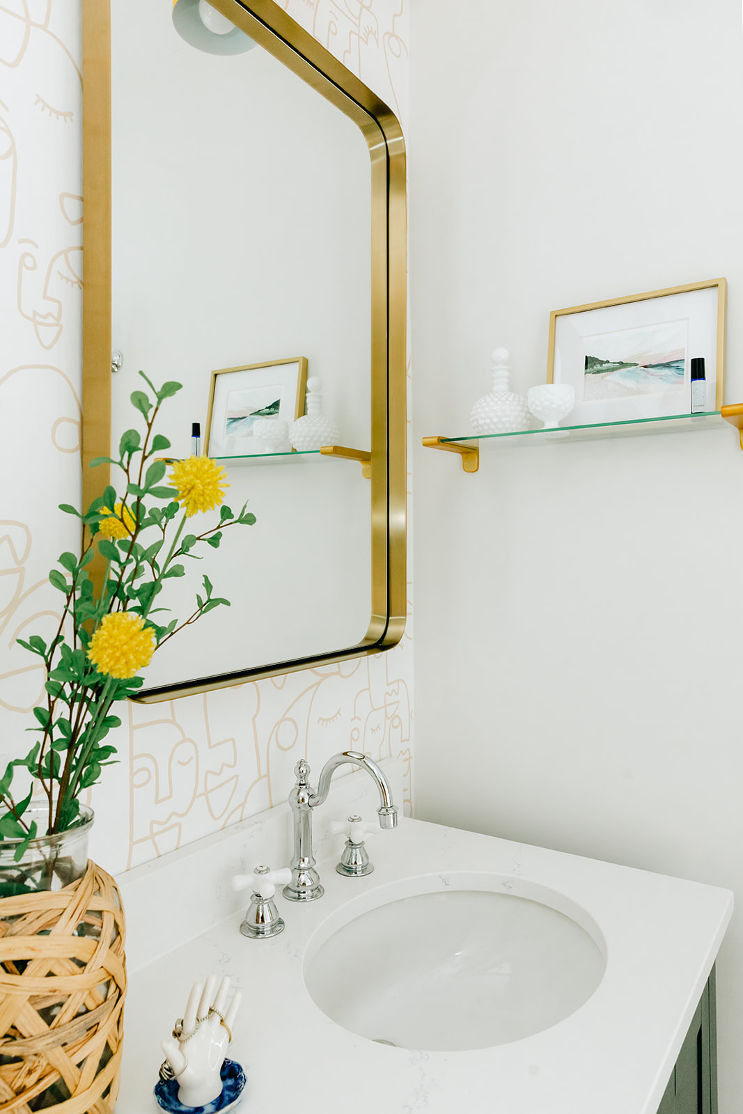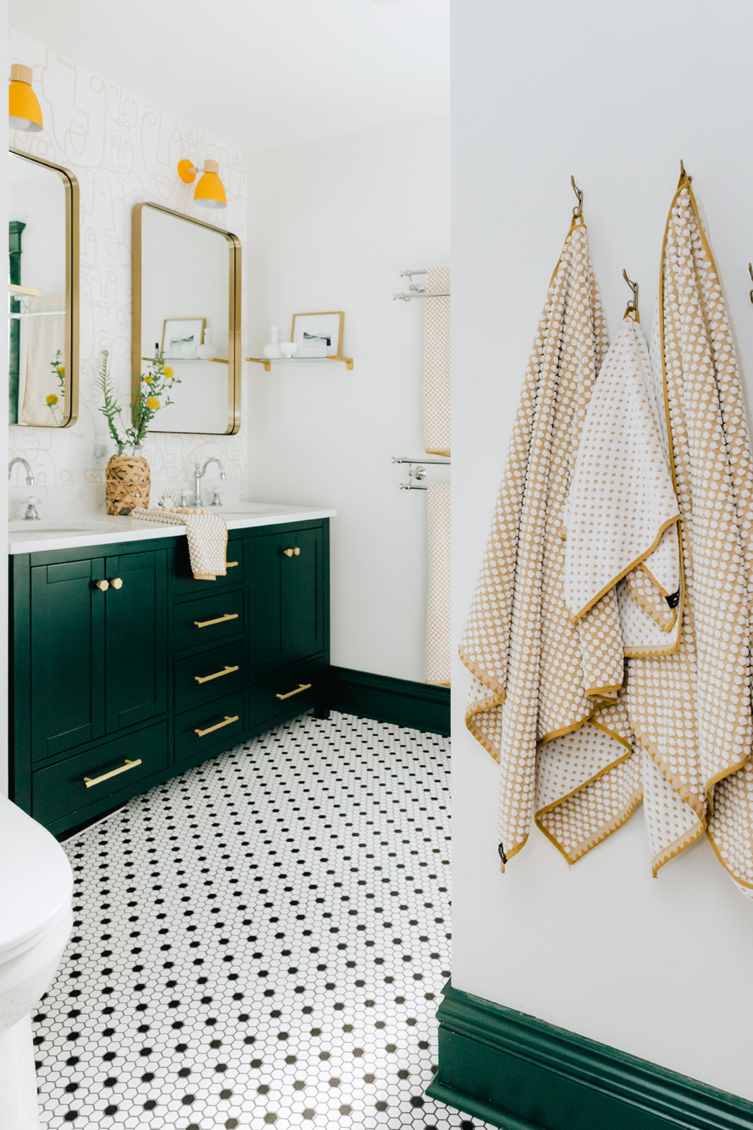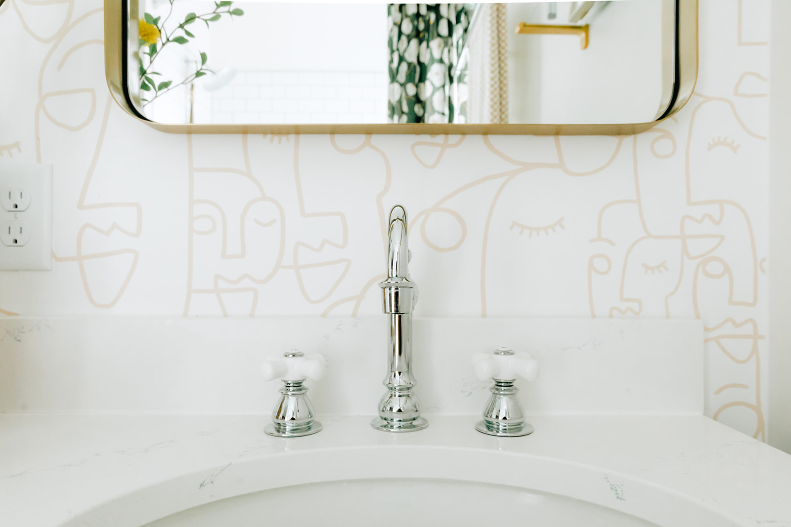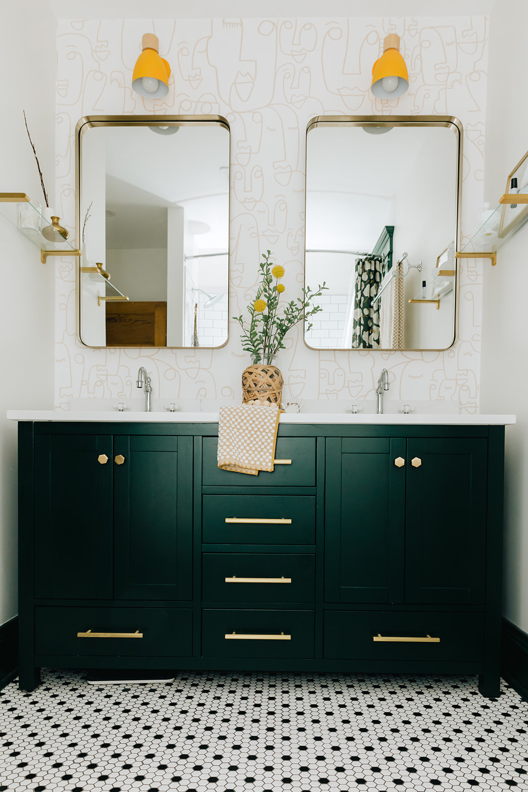The material plan was a combination of class + colorful. We wanted the space to feel like a perfect blend of our eclectic + bold clients (hi sis!) while also fitting inside the original bones of the house. This meant we went for a couple of core classics– white subway tile in a classic 3 x 6 size PLUS a black and white 1″ ceramic hex on the floor. We then layered in color and pattern to bring out the personality of the space. The alcove was the perfect space for a focal wallpaper—we opted for a muted but modern face silhouette and topped it off with a stunning emerald green vanity and modern yellow lights.
