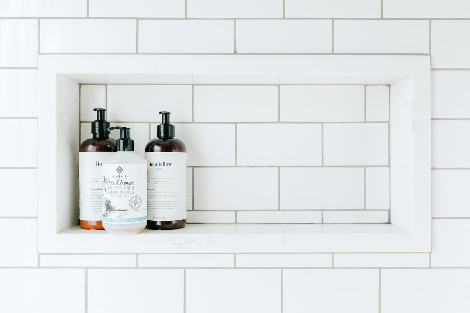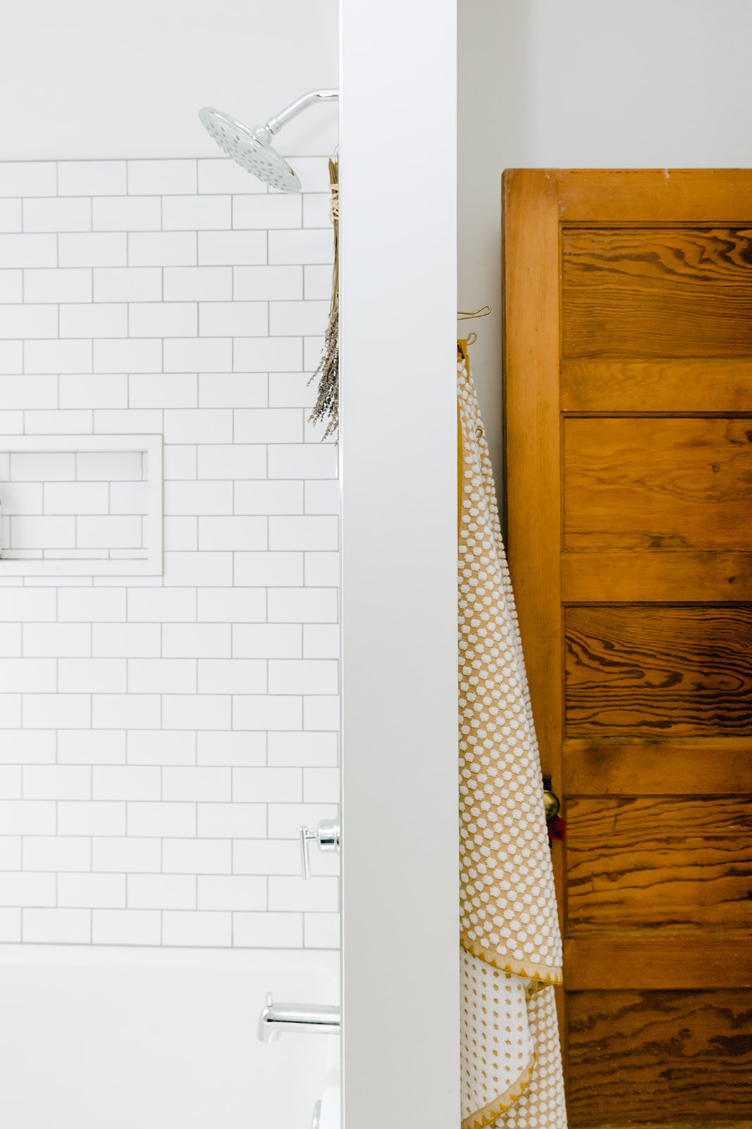 We made the hard decision to omit the claw foot tub in exchange for an alcove tub. This allowed us to waterproof the shower surround (bye -bye mold and leak issues) and also use the walls for storage. We added robe hooks on the door side, and shampoo alcoves in the shower. Additional storage came in the way of : brass + glass floating shelves on each side of vanity, maximized drawer storage in vanity as well as a built in medicine cabinet between the studs behind the entry door.