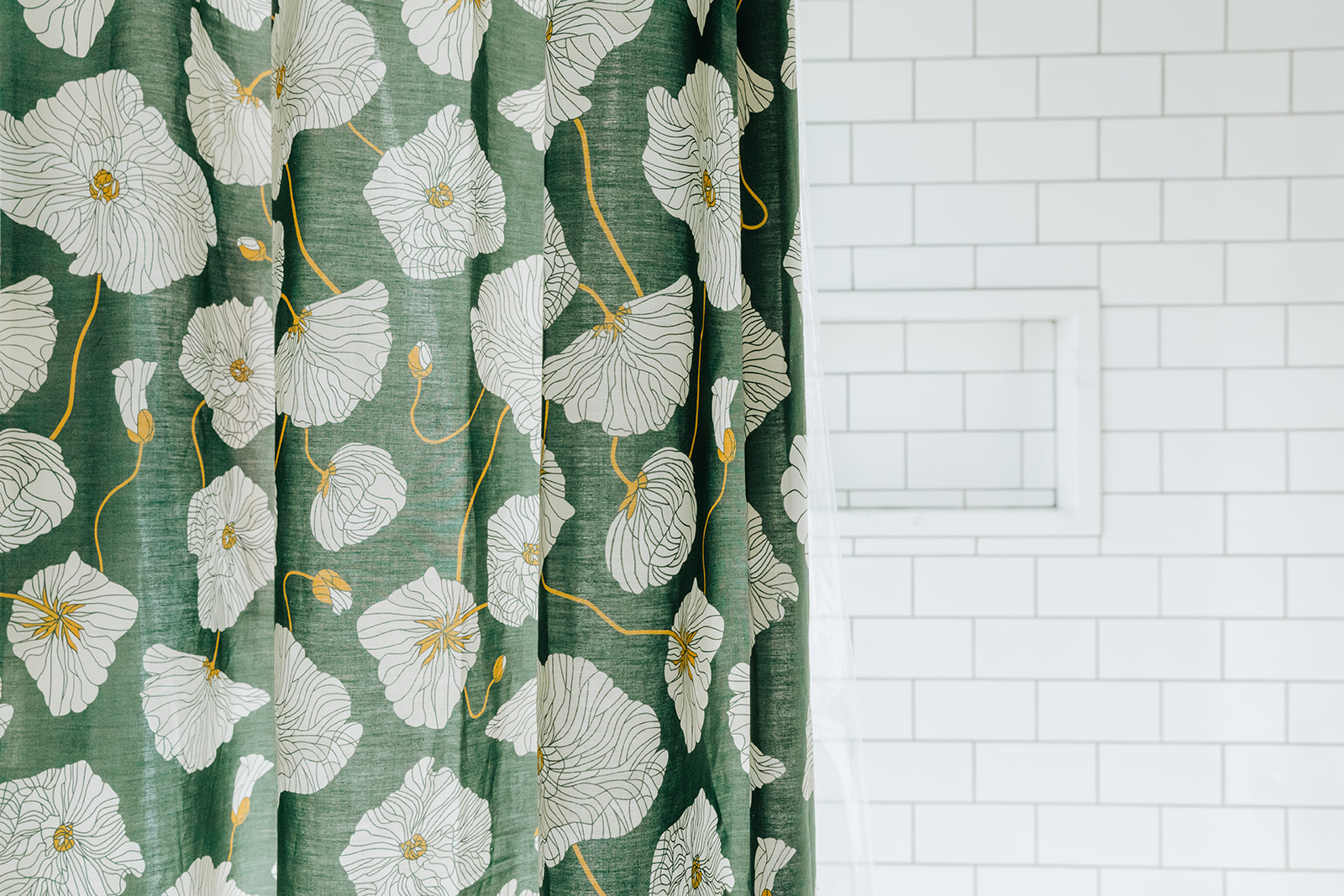 There comes a time in every project where we say– can we get one more material or pattern in here? The answer is generally YES, and in this case the green floral shower curtain was the final touch to bring this space together.