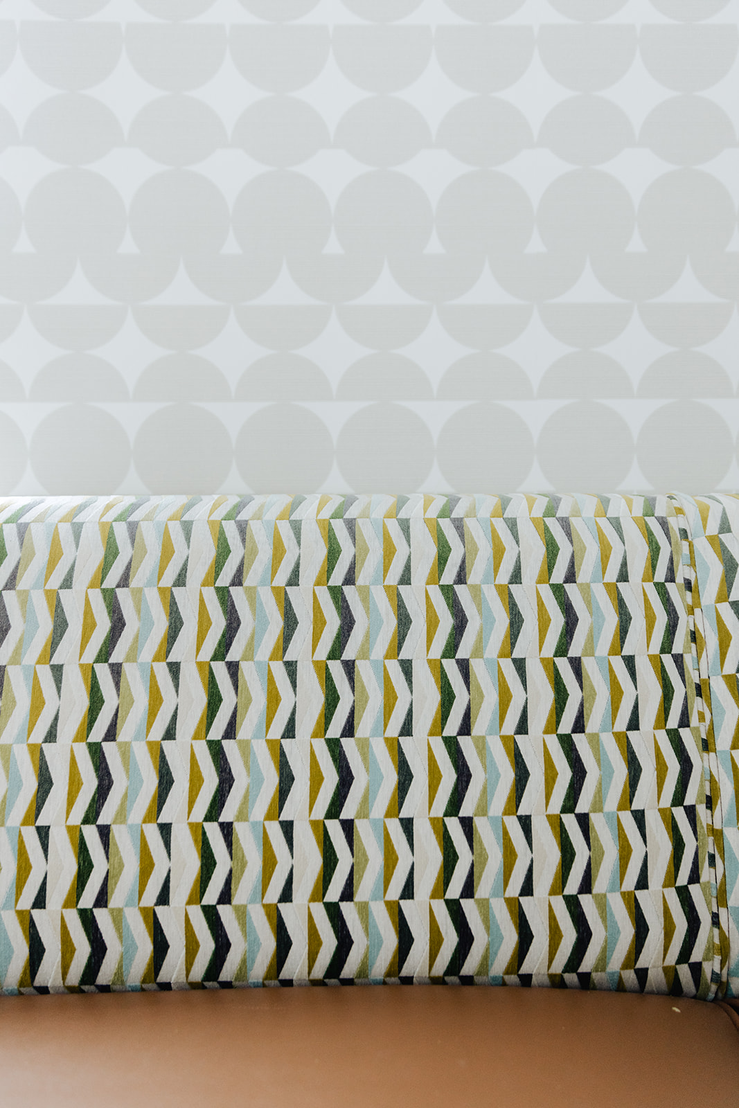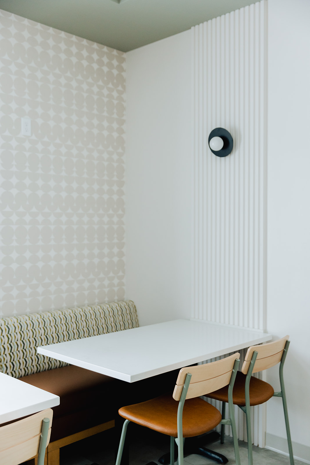 From there we layered in TONS of beautiful and functional materials. The walls and ceilings were painted a light neutral and the floors were replaced in a mix of 3 tiles to give visual interest. The booths were recovered in a funky pattern that brought in that class Third Street Bagel green. Pops of yellow