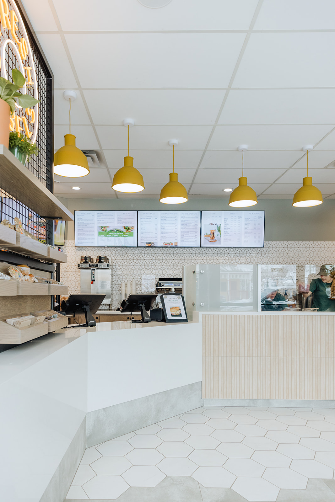 The main focus of the renovation was reorganizing the front service counter to make room for a new made-to-order salad station (yum!). We spent a ton of time making sure all the equipment will fit, and the flow of the space works properly from entering, queuing and paying at the point of sale. We were so amped to design the custom merchandise display for the point of sale and have that vision brought to life. Not only does it block the sightline to the back of house bagel prep area, it also conveniently stores all the items needed within quick reach of the cash register.
