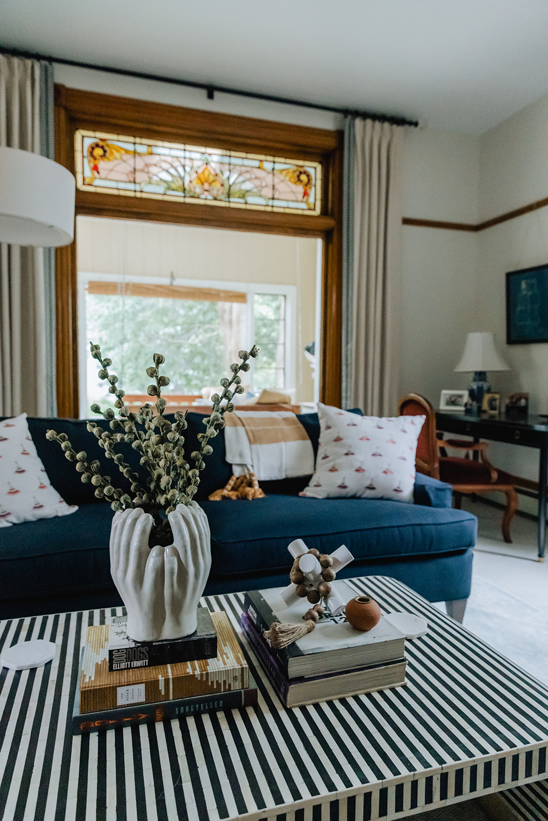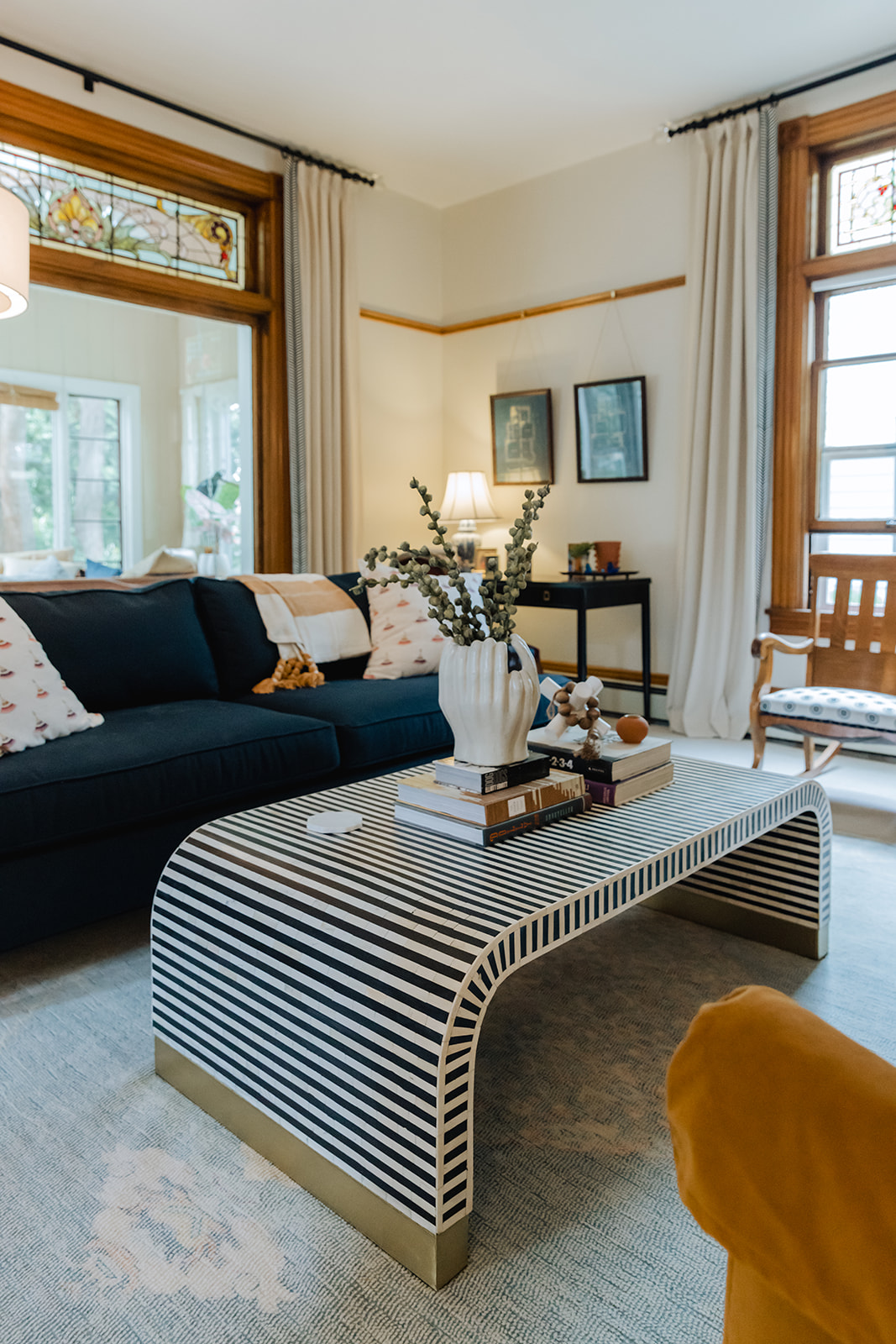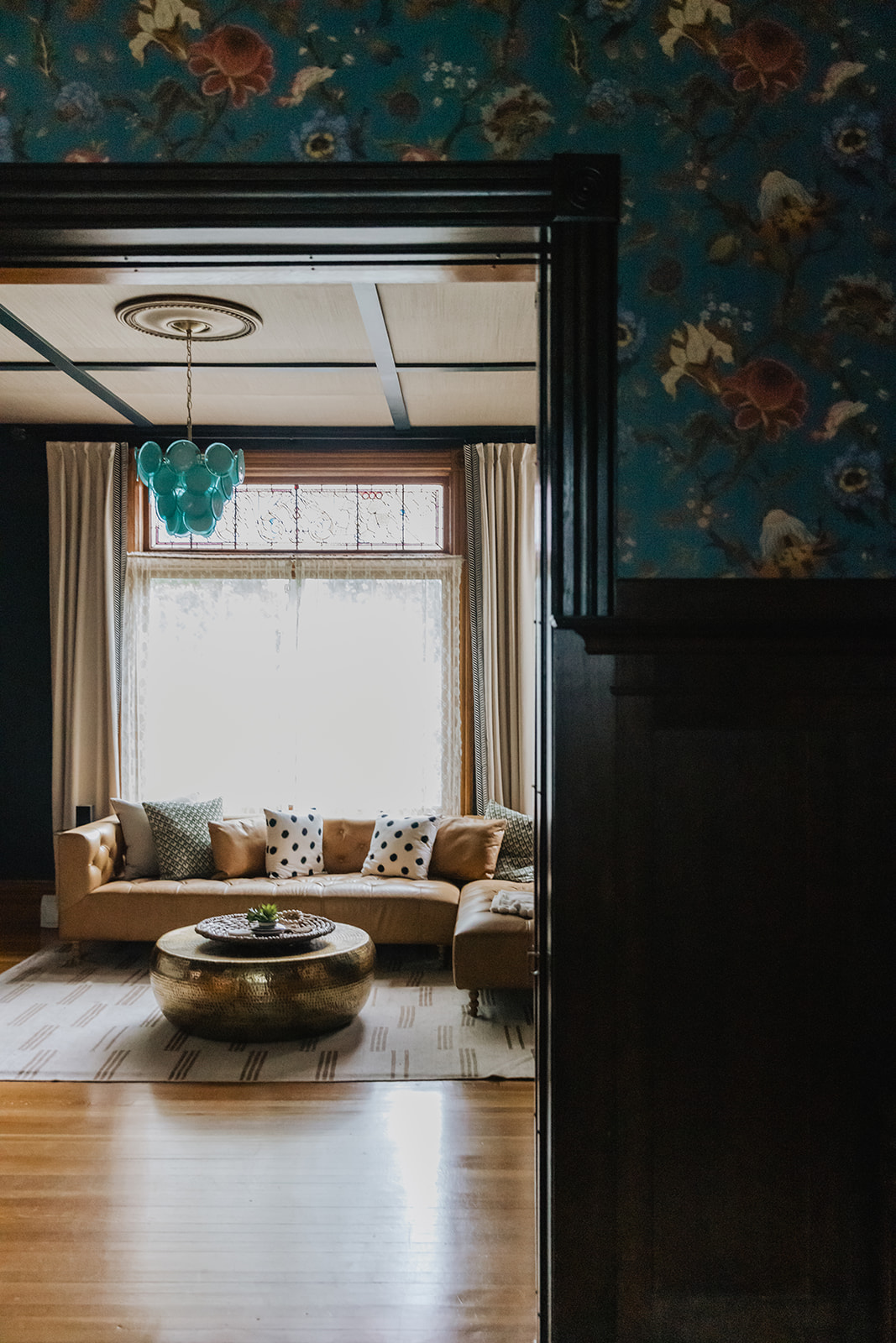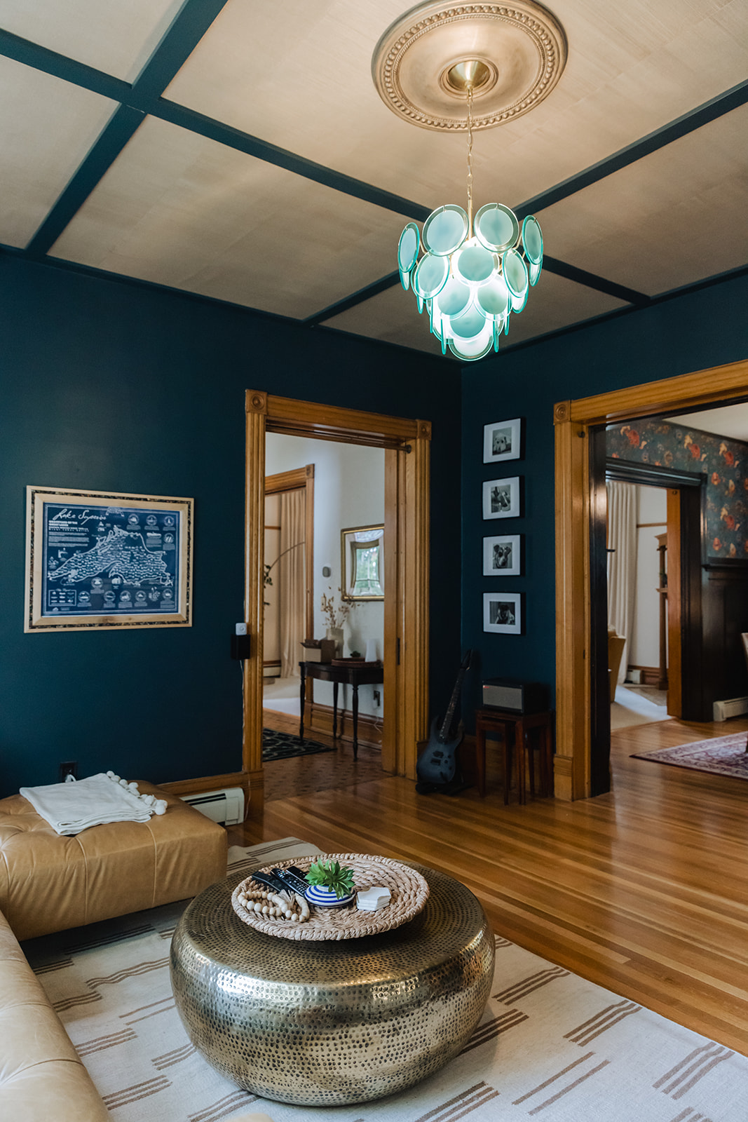 A total blank slate with AMAZING bones. We had so much to work with here— tall ceilings, Victorian Era details, and a fireplace in every room! The first space was to be used as a TV room and the second space was to be used as a more formal living room. A few major cracks in the plaster ceiling of the TV room was the biggest issue we had to deal with– project timeline and overall budget didn’t allow us to rip it all down and replace it so we had to get creative!