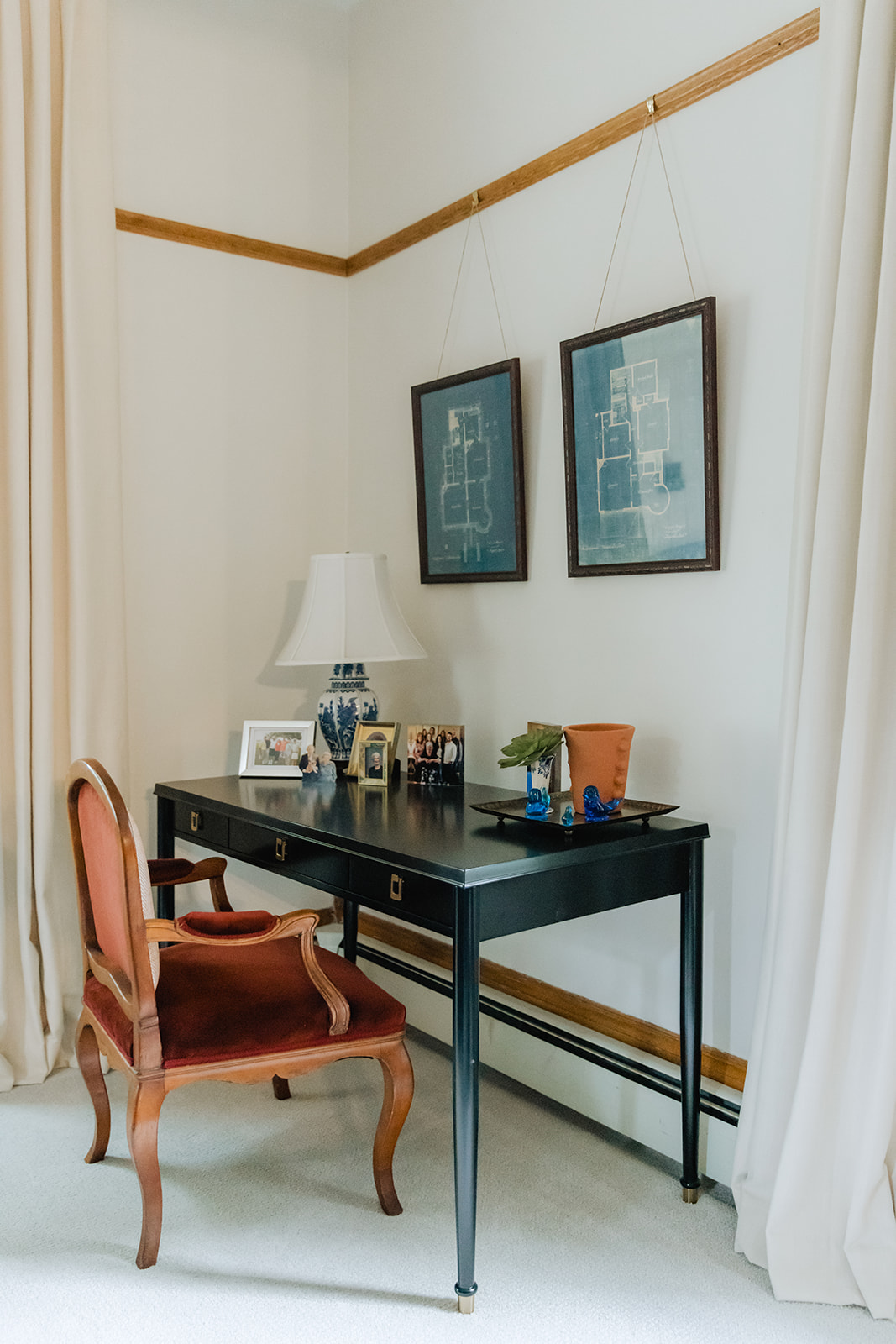 Both spaces would get custom drapery with dramatic black trim to help accentuate the amazing ceiling heights.