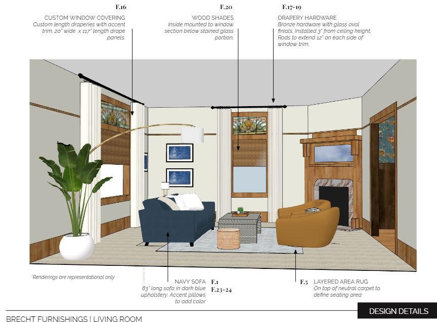 The Formal Living Room would be a bit brighter space. We lighted up the walls and replaced the carpet with a more neutral tone. From there we would create a seating grouping floating in the middle of the room, that focuses on conversation and views the stained glass and fireplace.