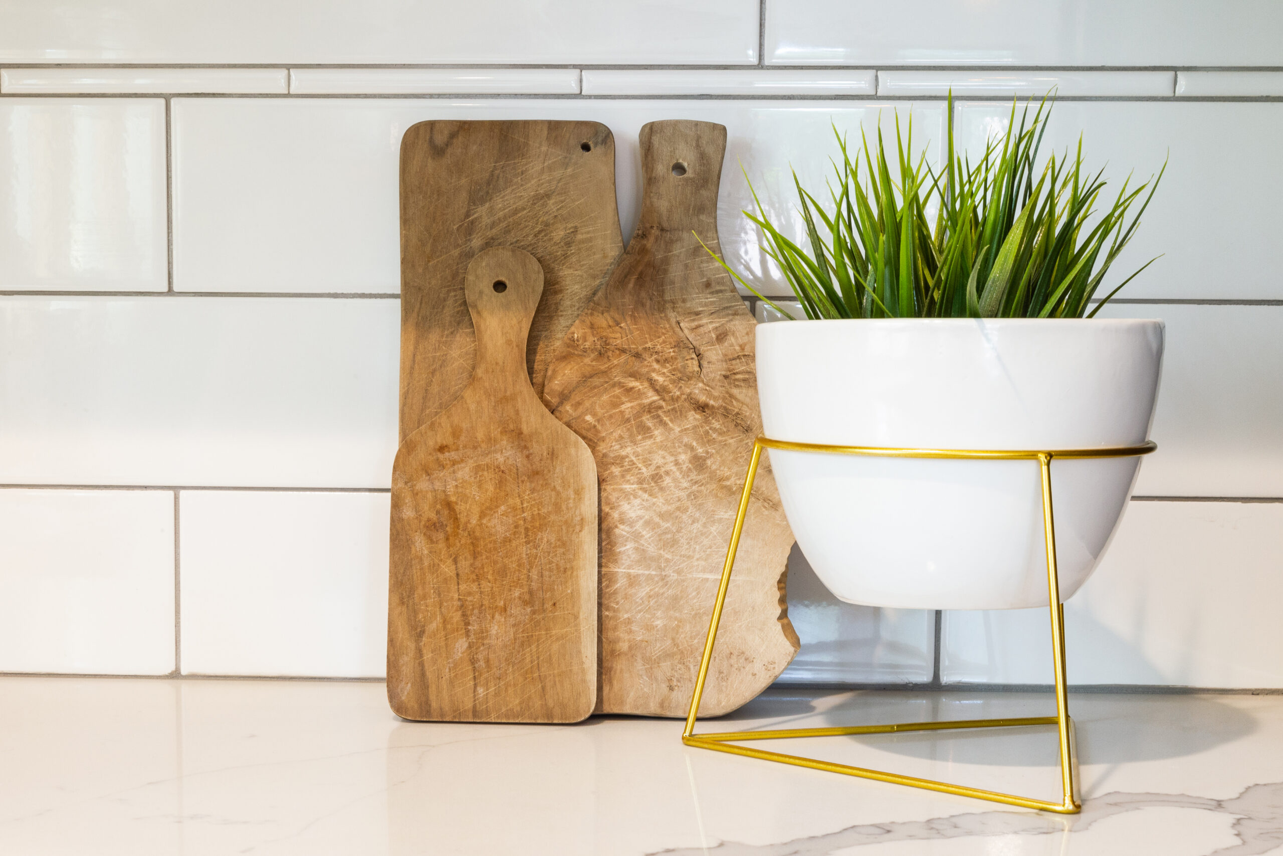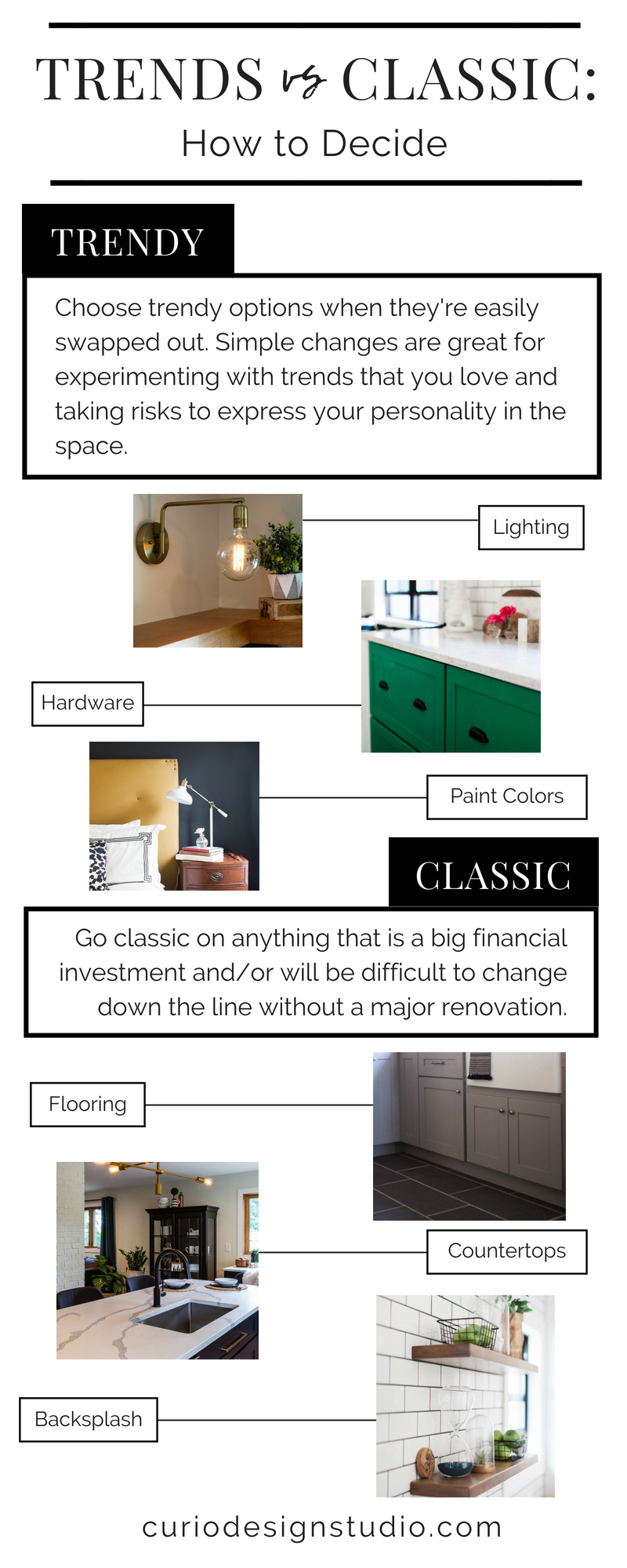 As a general rule of thumb, we advise our clients to go classic on anything that is a big financial investment and/or will be difficult to change down the line without a major renovation. Think flooring, backsplash and countertops.